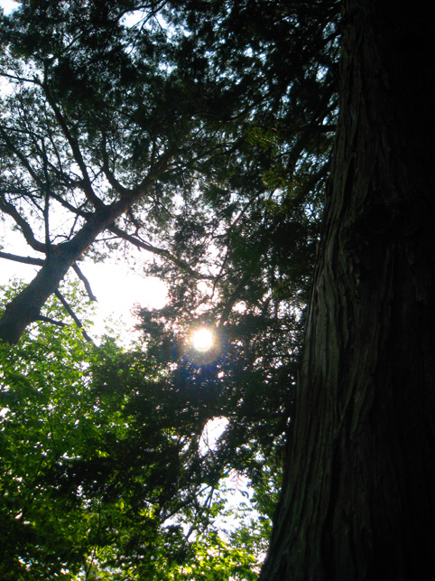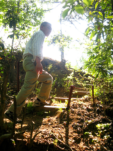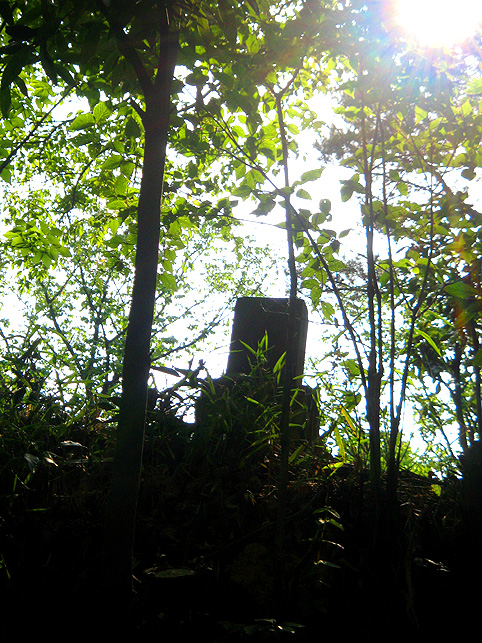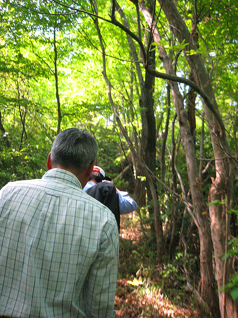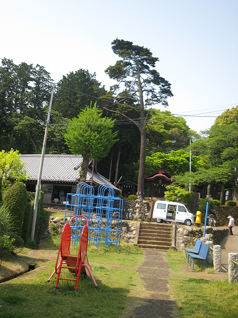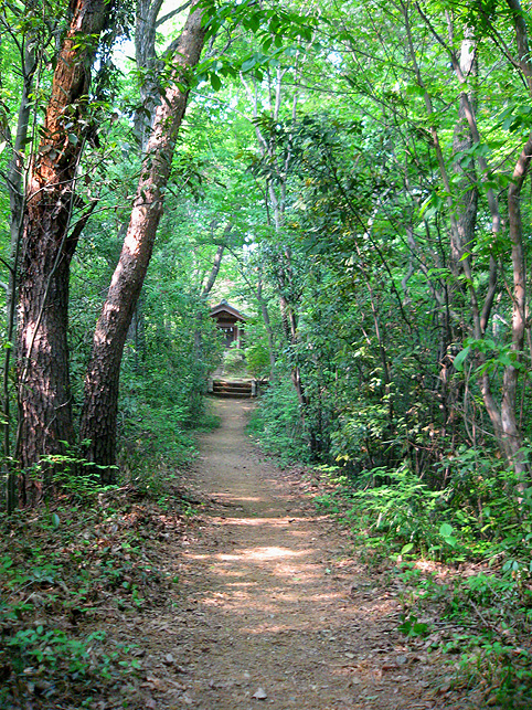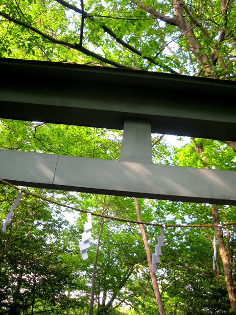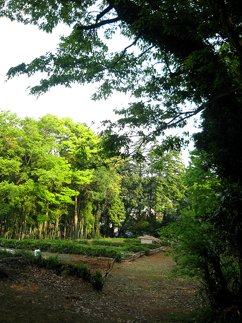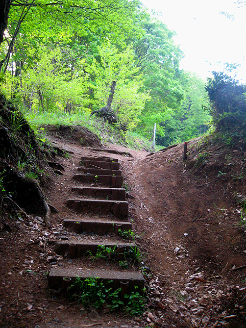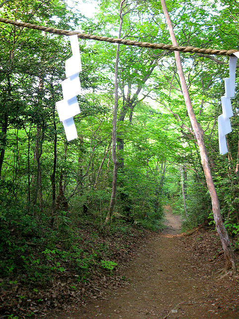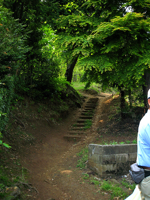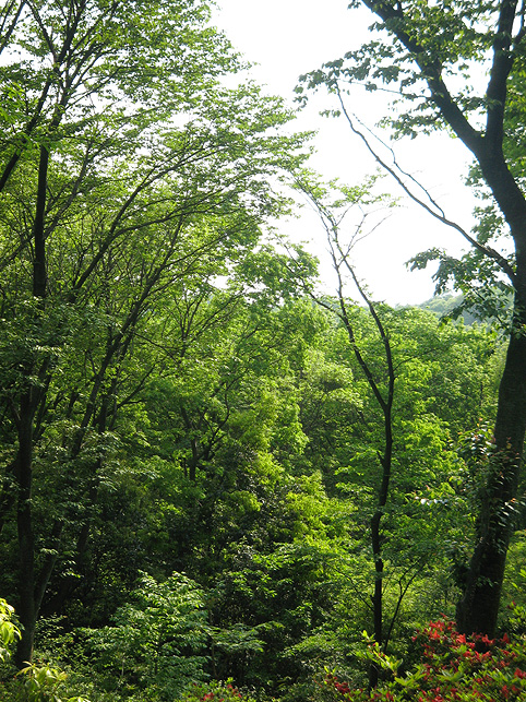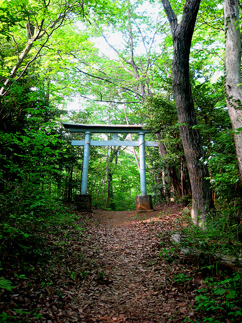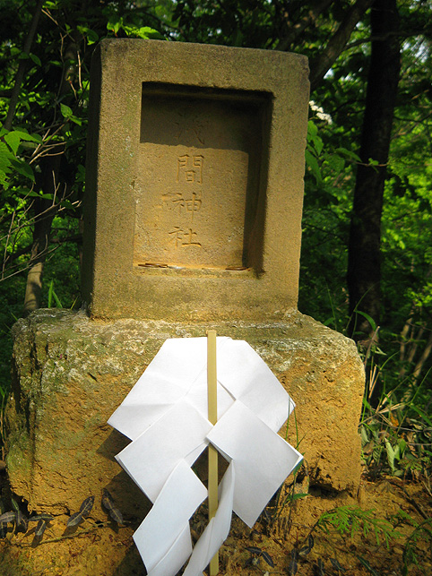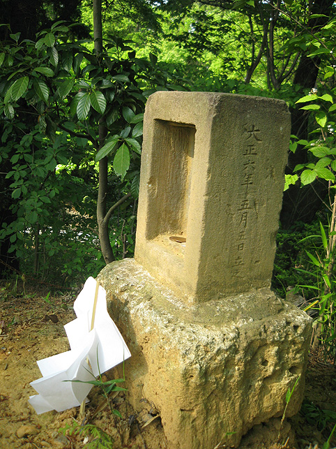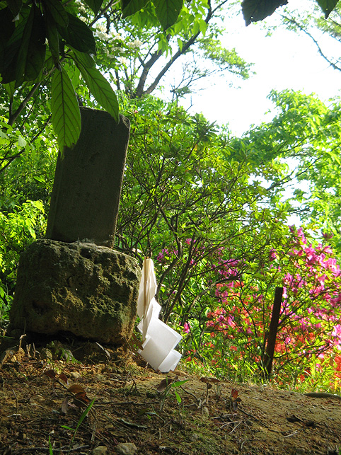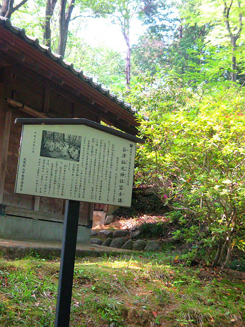 小祠と呼べる姿です。 頂上は、なんとも言えない穏やかな空気に包まれていました。 「浅間神社」と刻まれたこれは、大正6年5月5日、寄附によって建てられました。 本祭が5月5日と定められたのは、おそらくこの時からでしょう。 頂上に立つと意識が変わる。登山途中は「登る」という行為に集中し、山に対峙する自分がいるけど、いったん頂上に立つと、途端に意識は空間を滑り出す。 まわりをぐるりと見渡して、下界と自分、空と地面、今いる場所と遠方の富士山、宇宙と小さな塚、などなど、ポテンシャルな関係性をあれこれ思うのです。 これはひとつの富士塚トリック♪ 意識の変化。 私のリスペクトするアーティストの言葉に「アートとは、物事を違う角度から見るという行為」があり、私の座右の銘になっていますが、それをふまえればやはり、私にとって富士塚はアーティスティックな存在であります。 話が横道にそれました。とにかく、意識が変わるほどここは高い場所なのでした。 標高およそ160m。木々の間から富士山が見えます。(天候がもっとよければ) 何度深呼吸をしたでしょう。生まれ変わった気持ちになって下山を始めます。降り口は南側。 そうだった、そうだった。谷津のセンゲンノヤマは、少し高いところに、さらに盛り土をしてできているのだった。横浜の山田富士や西谷富士のように。でもそれって、やはりフシギな感覚です。(屋上に設置した「メタル富士」もある意味そうだけど)高いところの富士塚は、空に近いぶん、一層宇宙的(?)な感じがするのです。 富士塚をめぐる「宇宙感」は、折りをみて、たっぷりと考察してみよう。とにかく下山。 南斜面をたどり、西に下りる。するとそこには「金明水」「銀明水」がっ!!! なんということでしょう〜!「金明水」「銀明水」を表わすものはいろんな富士塚にありますが、いずれも石碑か小さな水鉢。でもここはホントの湧水! 人の手が加えられたとはいえ、これ以上の再現はないでしょう。 つづく。。。