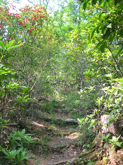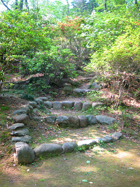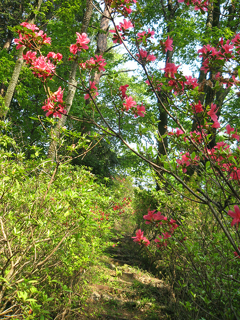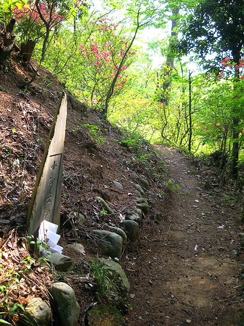 市ヶ谷とか麹町とかの地名が読めますが、この地に富士講を伝えたという、星行(本名:鮎屋猪兵衛)の住む土地でした。人物に関しては、別の機会に書くことにします。 とにかく、神社社殿の右側から富士塚に登ることにします。看板には、 こんなふうに書かれています。道案内をしてくださった氏子のふたりのうち、おひとりが星行から教えを受けた藤七の末裔の方でした。 では、登拝いたします。見取り図はこんな。 登山道に足をかけ。 しばらく行くと たくさんの花に迎えられました。「すてき〜♪」 頂上付近になり、正面から登るのかと思いきや、左に進路を取り、お中道を時計まわりに歩きました。 小御嶽に拝み、 塚の北側(裏側)から頂上を目指します。木漏れ日が美しい。 ご案内くださったのは氏子の方々(富士講員ではない)ですが、祭礼のときと同じように歩いています。この道順は、渋谷区の千駄ヶ谷富士の開山式のルートに似ています。 つづく。。。 |