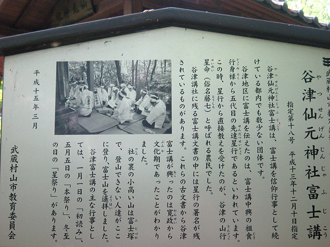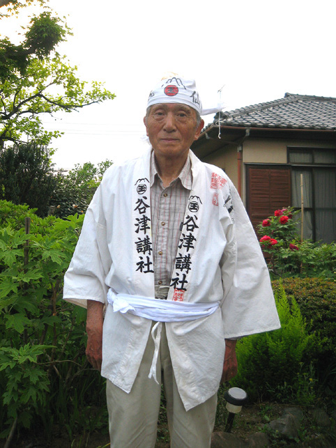 道案内してくださった氏子さんたちが去った後、私はしばらく富士塚に残ってその場の雰囲気を味わっていました。やはり富士塚は、お浄めや拝みをした後は独特の清涼感が伝わってきます。登拝するには、こういう時がいちばんオススメです♪ 森の中の一本道を歩いて、谷津公会堂まで戻って来ると、数人の氏子の方たちがまだいらっしゃいました。呼びとめられて、ビールをつがれたり供物のバナナをいただいたりしているうち、 「富士塚に興味があるの?え?この本書いたの?」(ちょうど「ご近所富士山の謎」を持っていたので、自己紹介のついでにお見せしました) 「へぇ〜。富士塚ってたくさんあるんだ!このへんで富士塚って言えば『どろっぷじ』だよな」 近くの荒幡富士のことを指しているのがフシギでした。だって地元には立派は「センゲンノヤマ」があるのに。もしかして、谷津富士は富士塚とは違う認識なのかしら??? などと考えているうち、ひとりが 「ちょっと待ってて。先達を呼んで来てあげる」 間もなくして、谷津講社の先達、内野氏がいらっしゃいました。恐縮です〜。 「あなた、TVに出てたでしょ。本も読みましたよ」 ひぇ〜、益々恐縮です〜。 「うちはすぐそこです。お見せするものがたくさんあるからいらっしゃい」 さらに恐縮です〜。でももちろん、喜んで! 先達のお宅に行くと、祭礼で着た行衣が3枚干してありました。 「ああ、こちらですね。今朝着てらしたのは」 そして、御座敷には「横須賀丸伊講」と「横浜丸金講」のマネキがありました。 え?どういうこと? なんと、内野先達は横須賀丸伊講の斎藤先達と横浜丸金講の岩岡先達と交流があったのでした。 そして、惜しみなく谷津講社の活動をお話になり、貴重な資料もたくさんくださいました。 ええー!いいんですか? 「いいんですよ♪ 『仲間』ですから」 これにはじ〜んときました。なんと有り難い言葉でしょう。講の方が、私に対してそう思ってくださることは、私にとってギフトです。そう言えばこの言葉、「仲間だから」は、他の先達からも言われたことがあります。 本当に嬉しく思います。これからも、謙虚に勉強させていただきます。そう思うのでした。 「先達、おいとまする前にお写真を一枚撮らせていただけませんか?」 ちょっとしたスナップを撮るつもりだったのですが、先達は干してあった行衣をさっと羽織り、カメラの前に立ってくださいました。さすが、これが正装ですね! 本当にありがとうございました。 以下、先達の親の代の頃の古い写真です。 大正13年の富士塚増築(高さを増した)の際の講の人々。前列中央が先達の父上。皆でクワを持っているのがわかります。土は、北側の残土(多摩湖付近)を使ったそうです。 これは、休憩タイム。富士塚の大きさ高さが見てとれます。