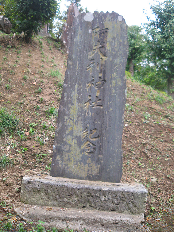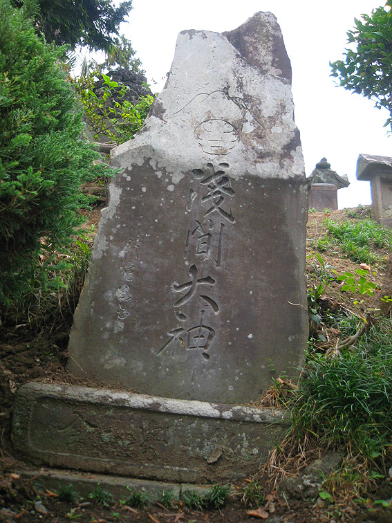 さて、この豊田本富士。 猿のいる頂上が特徴的ですが、斜面はいくつかナゾのまま。 奥宮と赤い鳥居は、富士山の方角を向いて一致していますが、 直線の石段(登山道)は右側にあり、真南を向いています。 登りきると金比羅神社の社。 奥宮に行くには、そこをすり抜けて左奥に進みます。 石段の右斜面には、磐長姫神社。 コミタケの代わりと言っていいでしょうか。祭神は同じコノハナの姉だから。 一方、左側には、 角行&食行の石碑。 そして、その下方にあるのは、 鹿島大神。と手前に合目石。 とろけたみたいだけど、七合目でしょうか。 時計回りに少し歩くと、 阿夫利神社つまり大山の神様。手前には、 数字がわからないけど、合という字があるから合目石。 何となく、土のかぶせ方が新しい気がします。 最後に、 位置的にこれもナゾな浅間大神。ヤマキチ講の紋もリッパです。 ちなみに、石碑のレイアウトは下のとおり。 浅間大神碑(先端が白い三角碑)の裏にも細い道がありました。 しかしこの塚の土は崩れやすい。きっと何度も造り直しているでしょう。 その度に何かが埋まったり、逆に出土したり。。。残りの合目石も絶対土の中だ! 頭上がうるさいと思ったら、 ヘリでした。羽根が止まったように撮れたせいで、なんか虫っぽいな〜。 白髭神社をあとにすることにしました。 北に行くと、もうひとつ富士塚があるはずので。。。 Facebook あり〼