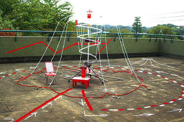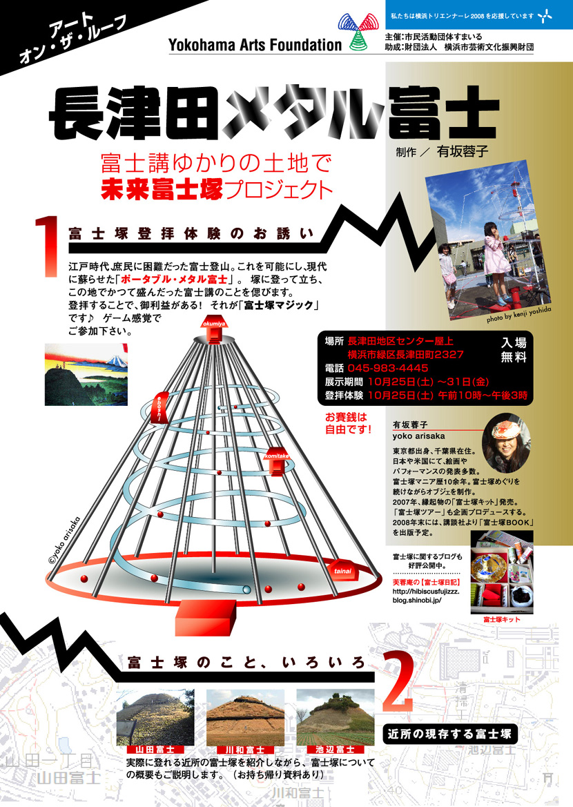 「メタル富士」は、現代のポータブル富士塚です。 過去、2007年、2008年、2009年と建ててきました。 横浜市緑区長津田の大山街道沿いの地区センター屋上に2回、 そしてNHK番組「熱中時間」のスタジオに1回です。 今回建てたのは、横浜市都筑区の大塚・歳勝土遺跡公園(弥生時代の遺跡)。 「都筑アートプロジェクト2014」の「NEW TOWN ISEKI HOUSE」 の参加です。 9月21日(日)〜10月19日(日) 横浜市営地下鉄センター北駅近くの大塚・歳勝土遺跡公園 この一帯は、ニュータウンとして宅地造成が多いですが、 環濠集落というムラを形成した遺跡もある珍しい場所でもあります。 丘陵の突端にある地形は、富士山の眺望が素晴らしかったポイント。 遺跡ハウスのポスターは、横浜市営地下鉄「センター北」駅から 横浜市立歴史博物館へ向かう道に貼られています。 メタル富士は富士山の方角に向かって建っています。 踏み台に登っただけで「メタル富士登頂」+「富士山に向かう」という仕組み。 また、メタル富士は想いを飛ばす「送信所」でもあり、ここでお参りします。 拝んだ後は、自分の分身となる赤いビー玉をチューブに投入します。 ビー玉は螺旋を描いて下山し、登拝記念としてお持ち帰りできます。 奥宮、烏帽子岩、小御嶽神社も設置されています。 夕方になると、日時計のようなメタル富士が長い影をつくります。 都筑区には3つの富士塚があり(山田富士・川和富士・池辺富士)、 第4の富士塚がこのメタル富士です。 Facebook あり〼 屋上の壁や地面も含めて富士山なので、全てをカメラに収めることはできませんが、だいたいこんな印象ですかね〜。 登拝の順路等は、私自身のレポートよりずっとわかりやすい記事が こちらのブログで読むことができます。hozhoさん、感謝でございます♪ |