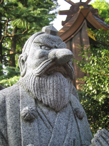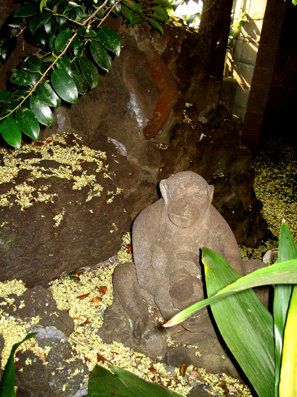 神社本殿の影になって暗いスペースに、兄弟子猿をかかえた母親猿の像。小さいほうはお乳をねだって甘えています。富士塚に猿の石像は珍しくないですが、通常は狛犬のごとく、入り口の左右に台座に乗って合掌しています。これはとても珍しい。
