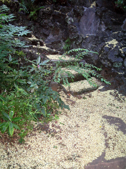 思わず叫びました。鉄柵をグリグリ開けて(神社を掃除していた方に訊ねたところOKをいただいたので、堂々と)足元を見たら、まるで雪が降ったかのよう。日陰になっていて暗い地面がこんなです。