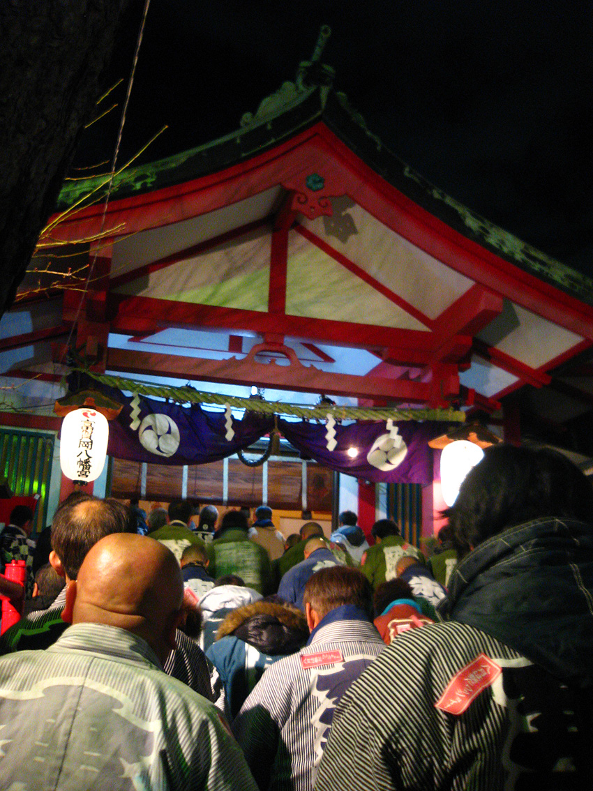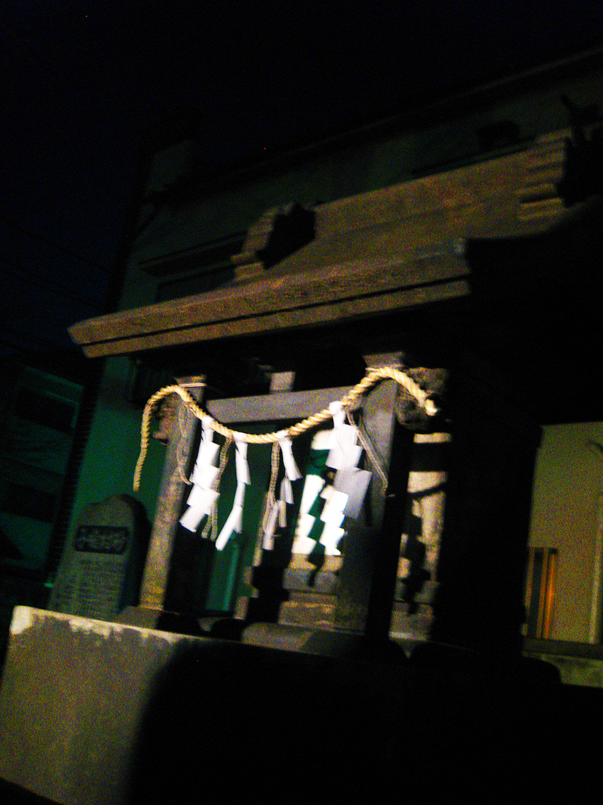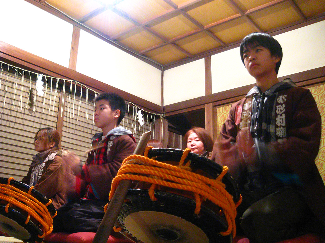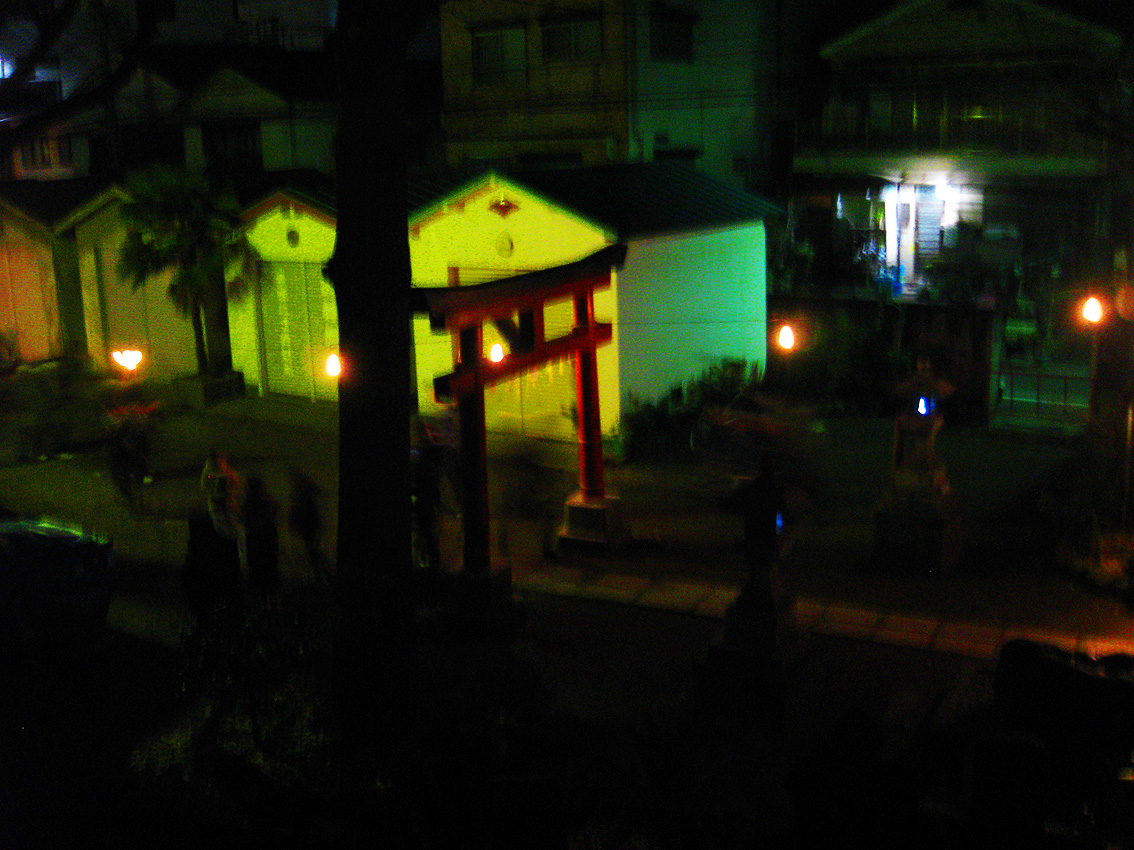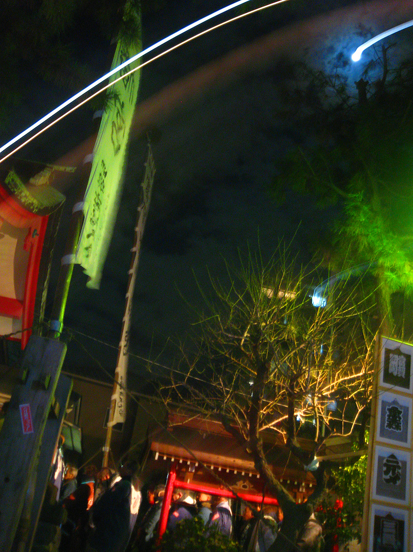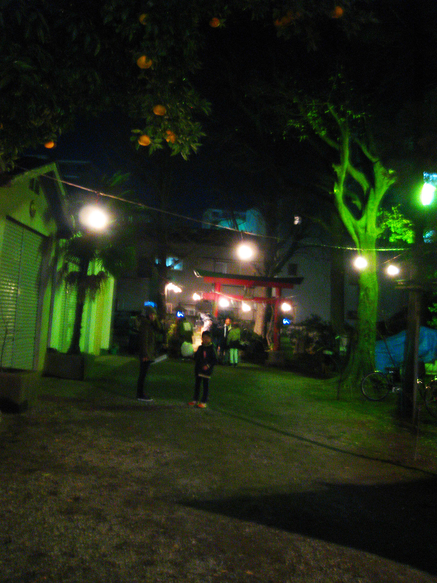 「山吉丸す御水講」の提灯も煌々としています。 知った顔を探しているうちに、あっと言う間に氏子の方達が 本殿に集まりました。 宮司によるお祓いが始まりました。私も一緒になって頭を下げます。 雲間から出てきた月が気になったので、抜け出して横から撮ってみた。 右上、泳ぐように写り込んだ2012年最後の月光。 立派な神輿も一般公開。デカイです。 すでに氏子さんたちの気合いが込められている! なぜなら今年は大祭(本祭)があるそうな。 区長も駆けつけ、檄を飛ばしていました。 火の粉にフォーカスしてしまったけど、いい光景です。冬の。 撥が早くて写らない。 友人も駆けつけ、富士講の方たちと飲んだのは、日本酒とコレ。 「富士山五合目奥庭みやげ『富士のこけもも』」のお酒です。 不老長寿ですって? 嬉しい!(やっぱり長生きしたいもの) 美味しかったです。ありがとうございました。 ちなみに私は「コケモモ」という名の響きが好き。 子供の時、ムーミンの本を読んで憧れたもんです(笑)。 奥の浅間神社も見に行きました。 夏みかん(?)がたわわに光っていて驚きました。 この光と影。色彩と闇。次元の階層。非日常な。。。 子供が立ちつくす。誰かを待っている。 去年(数分前)の自分の後ろ姿?いや、先を行く自分か。 灯籠にも明かりがついて、お宮が照らされています。 まっさらな紙垂が眩しい。 「富士塚もライトアップしたらー?」なんて言いながら、 イチョウの落ち葉を踏みしめて登拝しました。 (よい子はマネしないようにね) 参拝者はどんどん来ています。列もできました。 暖かい年明けでした。 Facebook あり〼