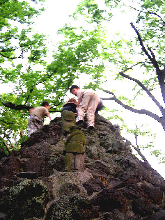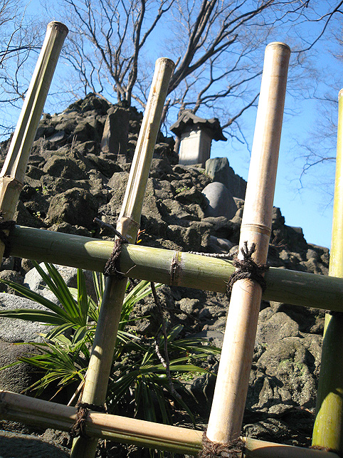 竹垣もこうして見ると、悪くない。 写真を撮りながら後ずさりしていましたら、この大木のかげに若い男性が立っていて少し驚きました。彼は木の幹に手の平を当てていました。私もよくするように、木の体温を感じていたのかも。。。 富士塚に近づくと、雀が一羽、登山者の石像に話しかけていました。 日向に回ってみると、コントラストの強さから、あることに気づきました。 今までないと思っていた「お中道」が、うっすら見えてきました。わかりにくいけど、確かにうっすらと。 今年になってからこんな立札が作られました。どうしたんだろう。何だか急に富士塚を気にし始めたような、この清瀧神社。 そう言えば、ここの狛犬はちょっと変わっています。左の「うん」の傍らに子狛犬がいますが、右の「あ」にも台座のところにいます。落語家の三遊亭円丈さんの、狛犬コレクションの本をずっと前に読んだ時、この狛犬も載っていました。 柵で囲まれた富士塚と以前の富士塚の様子。先月までは柵はなかったのです。 よし、裏まで回って観察してみよう! おや、光の具合で「大澤くずれ」がとても美しい。左斜面を行く行者の石像も苔むして色鮮やかです。う〜ん。意外とこの青竹柵は違和感ないな。。。とつぶやきながら歩く。柵は塚ぎりぎりに設置されていて、この円錐の富士塚の周りをすっきり回りきれます。 登れなくなったのは残念だけど、素材や作り方をよく見ると今まで見た柵の中で一番よい。竹の質もいいし、棕櫚縄も丁寧にくくってあります。そして、正面の登山口はこのように可動式の門となっていました。最大限竹を使用する工夫も見られる。これはなかなか好感持てました。塚の掃除や神事の時だけ開かれるのなら塚の為にいいことかもしれない。そう思うのは…… 確かにここ数年、岩が塚から崩落してたからです。近所の小学生たちが登っているうちに石が落ちるのも知っています。実は私も憂慮していました。正直に言えば、いつかこうなるのは予想をしていなくもなかったです。特に「今年はどうするんだろ!」と思っていました。 というのは、今年は4年に1度の「浦安三社祭」があるからです。大勢の人が集まるその祭に合わせて、神社は何か策を講じるのだろうかと頭をよぎったこともありました。この日清瀧神社の境内では、青年会の人達が、祭のための「鯉口シャツ」のサンプルを掲げていろいろ話し合いをしていました。 (浦安元町は、西組と東組に分かれていて、それぞれ西組若衆、東組連合と名づけられた青年会があります。祭では彼らの熱い活躍が見物ですよ♪) 今日からちょうど3か月後は「浦安三社祭」の初日「宵宮=よいみや」です。真っ暗な中、100基ある神輿全てに「みたまいれ」をする厳粛な場面に立ち会えます。町にはポスターが貼られ、いろんな告知や集会も始まりました。ワクワク感やドキドキ感を肌で感じられます。 富士塚がこのように柵で囲まれたのは、保存のためだけでなく、祭の時に人々が存分祭に集中できるよう、生活との共存を大事にしてのことなのかもしれない。……と、私はそんな結論に至りました。 この町で祭は神事としてとても大切です。ちなみに「浦安」という地名は、「日本書紀」の中でイザナギノミコトが言った言葉からとったとも言われています。(イザナギは、現在の日本のことを浦安と名づけました) |