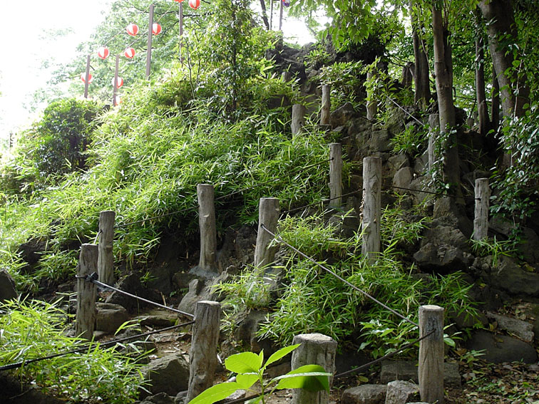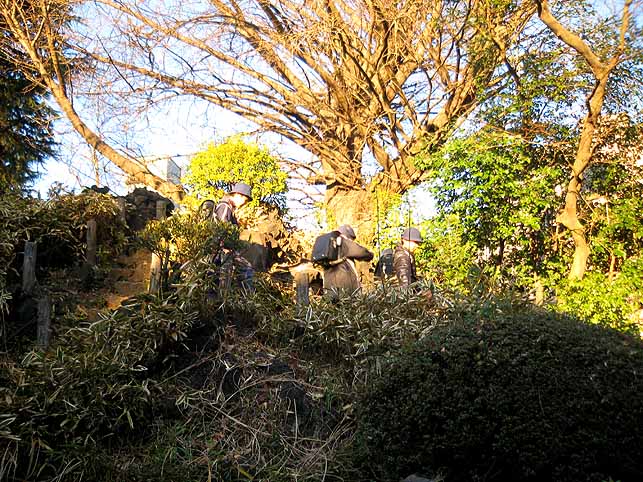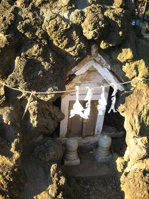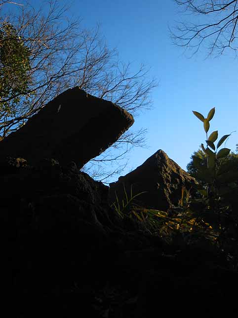 近年、冬になると顔がむくむので、帽子をかぶったままで映りたかったのですが、カメラさんから顔が影になって見えないと言われ、泣く泣く帽子をとりました。まあ、大事なのは私でなくて富士塚ですからいいんですけど〜(笑)。 撮影が終了してちょっと自由な時間が持てました。以前から気になっていた、千駄ヶ谷富士の「亀岩」をカメラにおさめようと思いました。実は、亀岩の存在は知っていたけど、撮っていなかったのです。いつも熊笹が繁りすぎていて、よく見えないからです。 でもこの日はよく見えました。位置は、正面から見て少し左。富士山の亀岩同様に8合目あたりです。画像の右上に写っているのが釈迦の割れ石です。 頂上付近から見下ろした図。左に見えるのは、里宮です。 8合目あたりの登山道から撮りましたが、これ以上接近できません。頭など、特に細部は作られていないようです。でも、甲羅のような盛り上がりはやはり亀っぽい。これはボク石(溶岩)でしょう。 ちなみに、この富士塚ではボク石は「頂上付近にのみ配されている」と言われます。神奈川大学日本常民文化研究所編の「富士講と富士塚」にそう記されていて、また、今年9月出版された竹谷靱負著「富士塚考」にも同じ記述になっています。でも、私が見た限り、斜面やふもとにもたくさんボク石がありました。 ボク石は多孔質なので、区別はつきます。風化し丸くなったものでも質感でわかります。それを証明するべく、次回はマグネットを持って行こうっと。