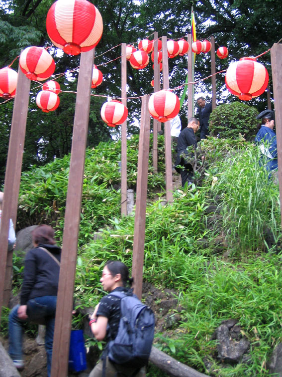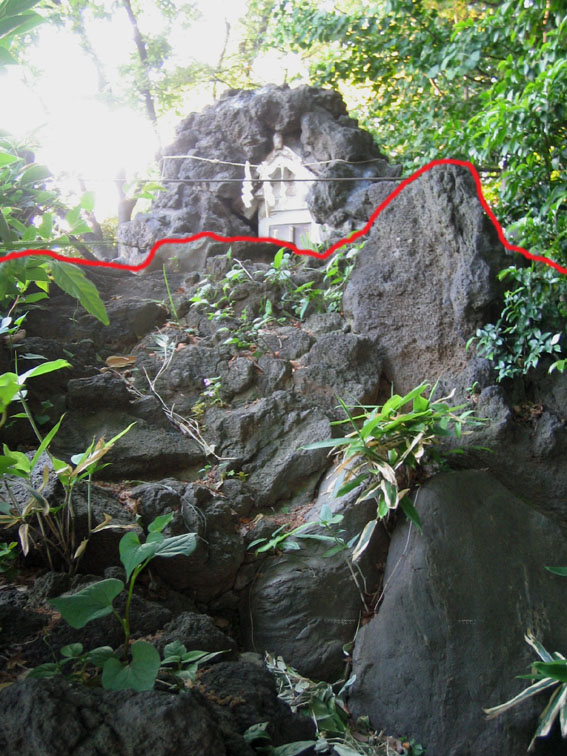 「銀明水」のせいで、南斜面が登山道だった説はひとまず保留。 でも、途中から右へまわりこんだ道はお中道となり、東側から 頂上へと石段がつけられています。それがこれ。 研究者にはこちらが正面という人がいるようですが、はたして? でも、この道もどうもうさんくさいのです。石段が新しすぎ。 私はやっぱり南側正面説でいこう〜!(笑) まあ、しょせん人工の富士山だから、旧道でも新道でもあまり 意味はないんですけどね。ほとんどの富士塚はいろんな石碑を 寄せ集めているんだし、いちいちツッコミ入れなくてもいいんです。 それでも、推理したり検証したりするのは、過去の人たちがどんな 想いで登ったか……想像するので楽しいわけです。 現代には現代の登り方がありますから、それを理解しつつ登る。 でもできるだけ、自分のカンで地面から嗅ぎとってみるのが 富士塚に登る醍醐味かと思います。 だんだんマニアックになっていくな〜私。 |