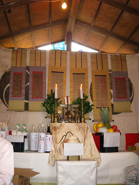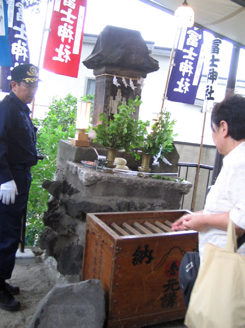 霊入れと呼ばれている神事は7月1日の午後(1時頃から約20分)あったそうです。残念ながら間に合いませんでしたが、後日いただいた画像で頂上での様子がわかりました。王子神社から宮司がいらして(富士神社は王子神社の境外神社です)講の方たちが浴衣姿で参列し、修祓の儀が行なわれました。