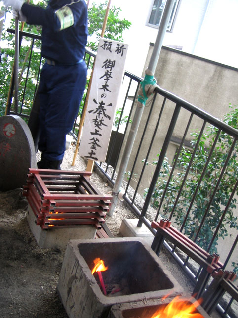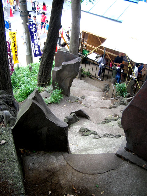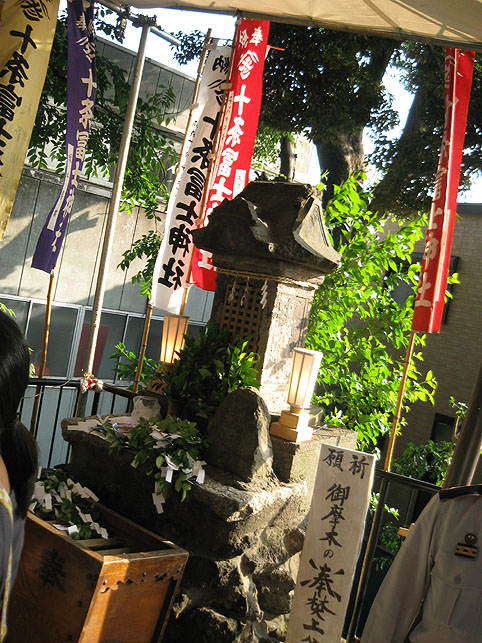 昨年のお山開きは、CSテレビ、ワンダーJAPAN TV #9東京の富士塚の取材でレポした十条富士です。 例年と同じ、十条っ子で盛り上がるお富士さん。 今年はどんな様子だろうか、と思いながら訪れました。 実は、ここ数年、塚の面する岩槻街道の拡張のため、 十条富士の取り壊し問題で気をもんでいたのです。 この塚が、左(道路側から)半分削られるしまうのは、正直、痛々しい。 今年が塚の見納めか、と内心フクザツでありました。 砂町富士の直会でいただいた、お酒の酔いがようやく醒めた頃、 講元と世話役から、ゆっくりお話を伺うことができました。 場所は塚の西側に隣接する集会所の座敷。講員の控え室です。 「昨年はお騒がせしました。いきなりですが、例の問題は?」 「お富士さんは存続です。お祭りも変わりませんよ。」 「えっ? それはいったい。。。?」 結論からいうと、 塚は、数メートルの移築ですむということでした。 道路拡張のため、塚は削られるけれど、 その分、集会所の建物と合体するという計画があります。 つまり、塚全体を西に数メートル移築し、頂上の奥宮も 集会所建物の上部に乗り上げる、というわけです。 私はひそかに安堵しました。 姿を少し変えることになりますが、塚の移築ですめば最小の ダメージになるのです。 時代の流れには逆らえないけど、富士塚の存続にいくばくかの 創意工夫があれば、私個人としてはとても嬉しいことなので。 集会所の外階段から撮った写真です。 塚の上部は、3月の大地震にも耐えた金属補強が健在でした。 なんだかんだ言っても、今を生きる人が一番大事。 今を大切にすることが未来につながることだから。 そう思えば、カタチを変えることくらい大したことじゃあない。 工夫をほどこすかぎり、きっと先人の想いは消えナイ! そう思いながら、十条を後にしたのでした。 ちなみに、ひとつ前の砂町富士も、 昨年には取り壊しの計画があったのです。 毎年、いろいろ学ばせてくれる富士塚なのです。