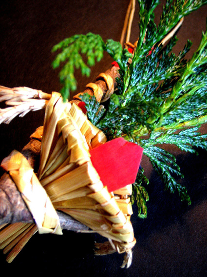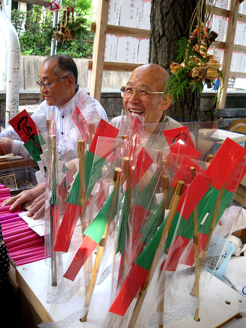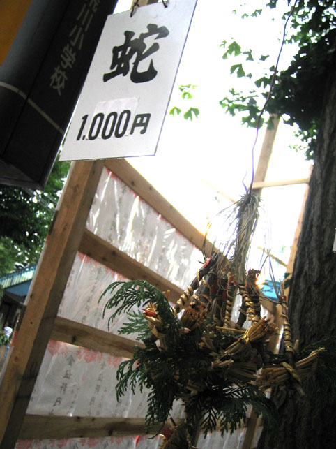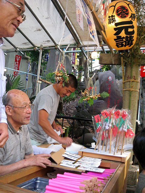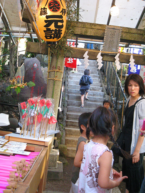 日光御成道でもある岩槻街道に到着すると、空は藍色がかって深みを増していました。旧道は、地面から異様な熱気が立ちのぼり、すれ違う人々も浮かれ目をしている。前方の森が十条のお富士さんです。 ひしめく露店から、いろんな匂いが混ざって流れてくる。 祭びとの望む早さで、闇が一気に降りてきました。富士塚はもはや形が見えない。 登山口が、見世物小屋のように妖しげです。 祭の時だけ小屋の立つ、ここが富士神社で、 昔と変わらぬ御三幅と御神体がお披露目されています。 お富士さんの登山口。人々は列をなして登って行きます。まるで宇宙船に吸い込まれるかのように。 毎年おなじみのお札や護摩木や線香の中で、ひときわハデなかたまりがありました。「麦わら蛇」(神龍)がバージョンアップしたのでした。 「麦の穂を切り落とさないで、うまく使ったんです」 富士講の世話人、Sさんが誇らしげに教えてくれました。麦穂は龍のヒゲとなって、確かに迫力が出た。枝振りの……じゃなかった、ヒゲ振りのよいものをSさんが選んでくれました。 講の方たちは何だか以前よりも熱心でした。岩槻街道の拡張計画のため、富士塚はそう遠くない将来に取り壊されることになっています。塚が消えるまで、彼らは地域に残ったハレの灯を燃焼しようとしているのでしょうか。とても熱いものを感じました。 富士塚の頂上では、お焚き上げの火が例年より遅くまで燃やされていました。
