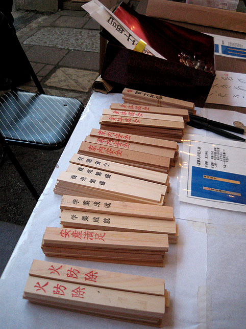 祝詞を上げ、お祓いをし、玉串奉奠(ホウテン)をしたということです。 登山口でお札や麦藁蛇を売る講の方達。去年の様子参照→お札 麦藁蛇 頂上で火の中に入れるお線香もあります。 「どれ買う?」「全部だよ」「あれ?お兄ちゃんは?」「もう登ってるよ」 護摩木はいろんなバリエーションが。この後一種類売り切れが出ました。ど〜れだ?(笑) 新旧の「御三幅」。外側の赤いのが古い。一番右が「小御嶽と大小天狗」、左が「五行御身抜」、左からふたつめが「このはなさまと書行と食行」 儀式の後の山頂石祠。玉串がこんもり。 ちょっと離れて見たお山です。右側から登って左に下りる。 露店のにぎわいの近くから撮った図。 |