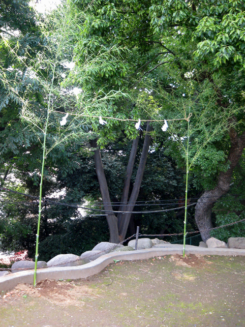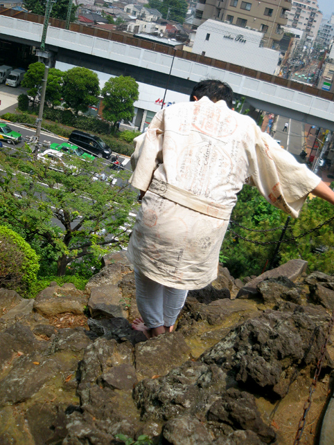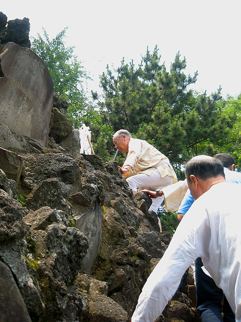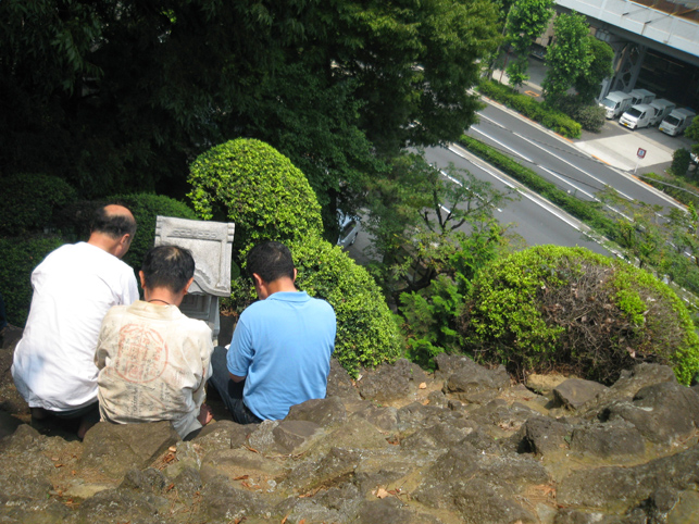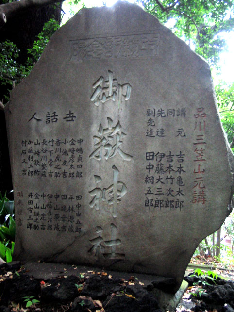 品川神社の正面石段を半分下ります。石段の途中に品川富士の登山口があるからです。先達は鈴を鳴らし、大麻(おおぬさ)を振ってお祓いをしながら進みます。 頂上には、富士山の方角に笹竹にくくられた注連縄(しめなわ)がありました。 その前で拝みをします。私も目を閉じると富士山の姿が見えました。有り難いです。 反対側の中腹にある小御嶽神社でも拝みをします。私なんか足元ガクガクなっちゃう急斜面です。 この丸嘉講は各地にあります。巣鴨、駒込、豊島、武州田無組、品川と刻まれています。「武州田無組」というのは清瀬市の中里富士を作った講ですね。