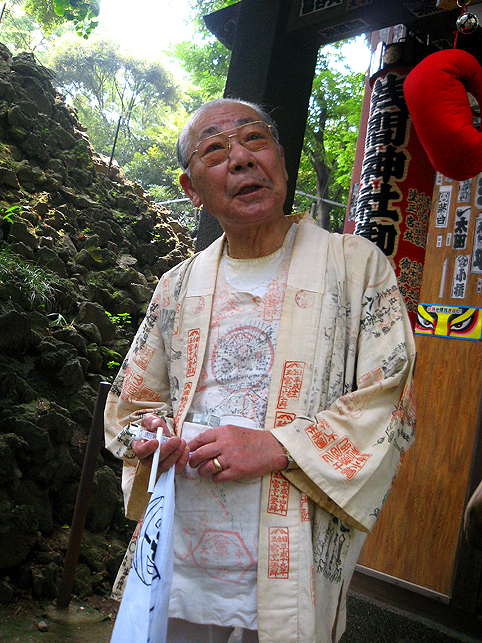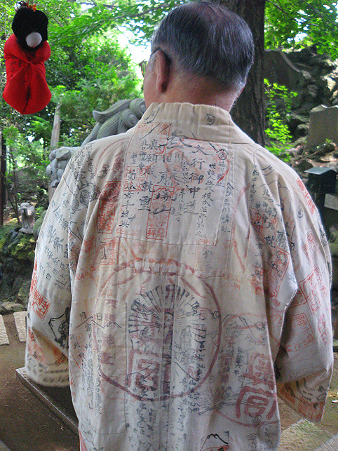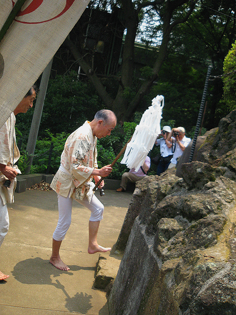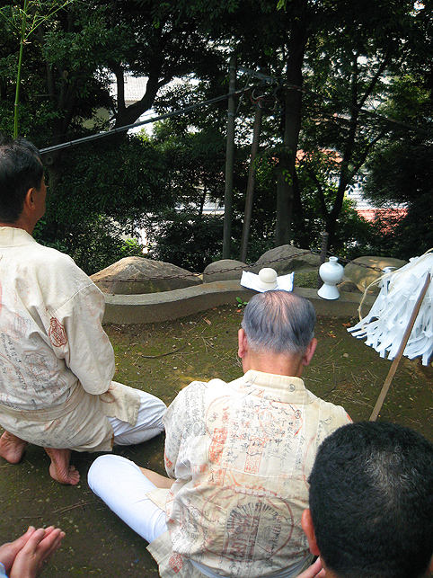 先達の素晴らしい行衣(朱印の余白がない!)の左奥に見えるのもお猿です。縫いぐるみのかわいい猿が提灯からぶら下がっています。お猿はこのほか、おかめ&ヒョットコの面を手に持つ石像のものもありました。 気さくにお話くださるE先達は現役でお山に行かれています。もちろん今年も。「初めて登ったのは昭和12年、講員としては34年からです。2度(喪中等で)行かなかっただけで、それから一度も欠かさずだよ」お生まれは大正15年! 「え?高山病になったの?急いで登っちゃだめだよ。私たちは『六根清浄』を唱えながらゆっくりゆっくり登る。少し行ったら休み、呼吸を整えてまた登るのです」その他、お中道の回り方(逆中道もあり)、大澤付近の怖さ、砂走りのことなどいろいろお話くださいました。お伝え本の解説まで♪ 朝8時から始まった準備です。お掃除、飾り付け、昼食の用意などいろいろあってお忙しい。社殿の外にも講員の方たちがまめまめしく動いてらっしゃいます。 中に入ることを許されて撮った、社殿内左側、品川富士に面した祭壇とその上に掛けられた掛軸。鳥居や掛軸はいつもは先達のお宅にあります。 社の外には新旧のマネキがたくさん並びました。これは新しいやつ。 11時頃には品川神社から神主が来て神事が始まりました。(神主によるお祓いは昭和37年から始まり、以前は講の方たちだけで行なっていたそうです) お山に向かってお祓い。 神主が去り、神職による儀式が終わると皆さんちょっと緊張がとけます(笑)。社殿内で昼食をとり(お赤飯のおこわと佃煮が美味しかったです♪地酒も♪)前日に仕上がった新しいお伝え本(ルビつき)など見せていただいたりして、しばし休憩タイム。先達は、テレビのインタビューを受けています。格子の向こうには品川富士ですよ。 それから講による儀式が再開。「拝み」です。独特の抑揚で「お伝え」を声に出します。 品川丸嘉講社に残るこの古いお伝えは御三宝に立て掛けて。 鈴(レイ)はかなり重い。これを鳴らしながらお山を登るのですね。もうひとつ、鈴(レイ)と呼ばれるものがあります。先達の前の小机の上にある、太い輪のようなもの。中は空洞になっています。これをひとさし指に通し、回転させると中に入っているもの(石?)が回って音が出ます。要所要所でふたつの鈴を鳴らします。 もっと写真を撮ってもよかったけど、自分も少しでも声に出したかったので、お伝え本を目で追うのに必死(笑)だったのです。また、神妙になっていたのでそれどころではありませんでした。文字からことだまになって、それが響き合うことに感動もいたしました。内容についてはまたいつか。 |