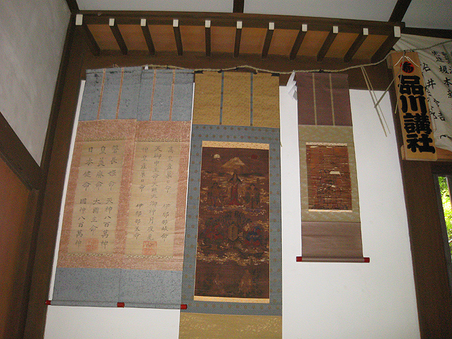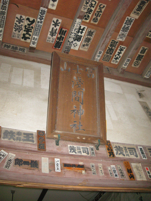 浅間神社の本殿に祀られていた「御神体」を拝ませていただきました。 儀礼の際には暗くて見えなかったけれど、こんなお姿でした。手前の御神鏡に外の品川富士が映っているのが見えますか? 鏡をよけたところ、正面からはこのとおり。 「木製ですね?」「さわっていいですよ」 一瞬触れさせていただいただけですが、すぐわかりました。 たぶんですが、桜とかの木の土台に、層の厚い胡粉地で滑らかに盛り上げ、着彩したものと思われます。その優美なこと!右側中腹に小さな段があり。小御嶽か宝永山もしれません。高さは30cm足らず。幅40cm以上。 「頂上には火口(窪み)があるんですよ」「ひぇ〜そうなんですか♪」 その中に御幣を立ててあります。裏面には「蓬莱山」と書かれているとか。蓬莱山、つまり富士山のことですね。