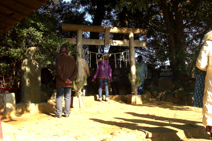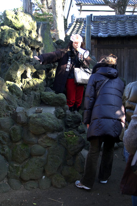 松戸在住で、ここ松戸神社をよく知る参加者の方もこの富士塚の存在は知らなかったようです。そうでしょうね、通常、社殿の裏などに行くことはないですからね〜。(ちなみに富士塚の隣のお稲荷さんはちょとコワイ。そこから先に行けません。まるで結界があるみたいでした〜) 富士塚はこんな感じで、陽があたりません。早い時間にはあたるはずですが。。。 「あ、また登り甲斐のない、ちっさな富士塚かぁ」と思われた皆さんに、塚の前で少々説明なぞして。 おひとりずつ登拝していただきました。 頂上の石碑に触れてもよし。撫でてもよし。 頂上と言っても、7,8段しかないのですが。。。 ここもおそらく移築か改築された塚だったと思われます。 石碑の配置にバラつきがあり、ナゾの作りでもあります。(詳しくは後日、ひとつずつアップの予定) 北風が身にしみてきたので、早めに切り上げてお茶会へと移動することにしました。ホントさっぶ〜!