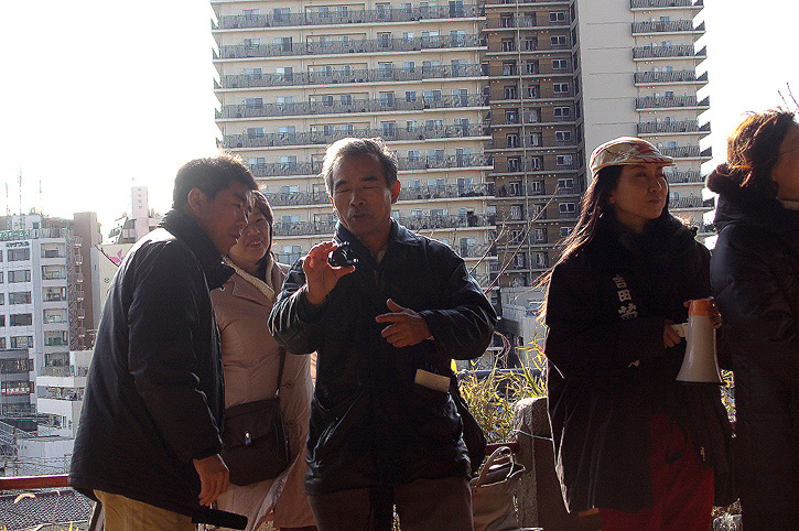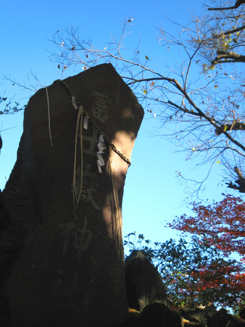 参加者の皆さんは、富士塚ビギナーばかりではありません。マニアの方や個別に探索したい方もいましたので、一旦山頂にて解散し自由時間を取りました。 私が連れ回した人達は、二重三重に入り組む登山道を歩くことになりました。私もちょっと迷って同じ道に出たりしましたが(笑)。。。 小御嶽神社(画像をコントラスト効かせてみたら、あらら、左上に「ハート」の空が!)を拝んだり、 富士塚には珍しい妙見(みょうげん)神社の前を通ったり、 皆でおかしがっているのは。。。 「実はこの陸橋の下が登山道の始まりなんです」 「ありゃ。これは『トマソン』に投稿せねば!」 橋の上に金山神社が鎮座しとります。 てなことで笑いながら歩いていたら、集合時間となりました。あれ?人数がひとり……足りない?多い? どうも狛犬も頭数に入れてたみたい。点呼を取ったら数が合いました。では、次へ向かって出発! 来た道と違うルートを取り、富士塚の南西斜面を臨みます。ああ、ここも建築が始まってました。流山富士でもそうでしたが、ちょっと見ないうちに富士塚の隣接地はこうして富士塚の形が見えにくくなっていきます。私が「富士塚が保存されても景観は保存が難しいから、なるべく早く見に行ってほしい」と言う理由がこれです。悲しい〜。 富士塚のあった根本城跡の裾には「岩山稲荷」もあります。 「これも富士塚?」と参加者の方たち。 ほら、小山を見ると富士塚に見えてきたでしょう?(笑)