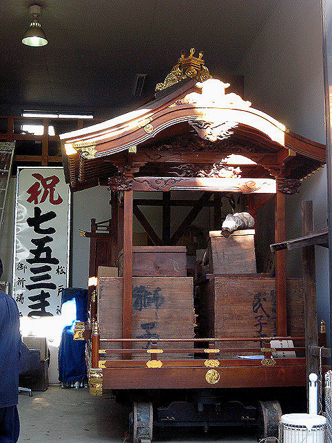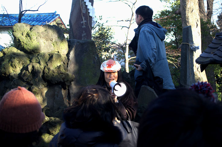 それほど広くない境内に、たくさんの神社があります。 私たちは、坂川に沿って北の入り口から入りました。 図面の上部、ピンク色の楕円のところが富士塚です。浅間神社と言わずに富士嶽神社 と呼ばれます。 来年催される3年に一度の大祭の為の、神輿もここの神輿庫に大事に保存されています。 12月のある日、保存会の人たちと神官たちが、定期的な神輿の点検を念入りにしていました。