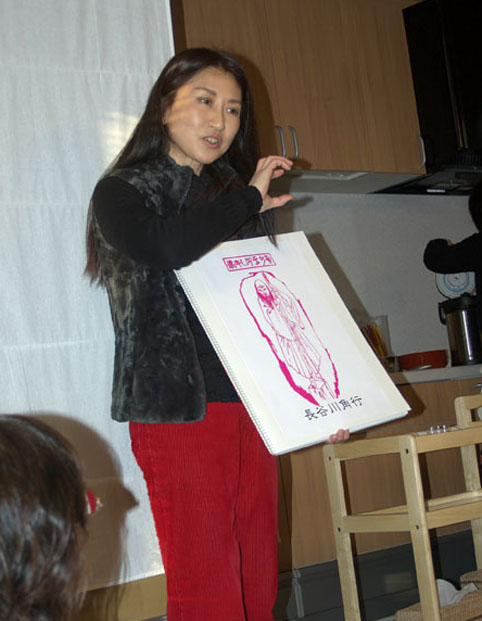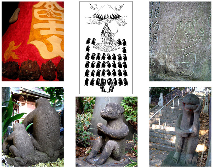 ******* ではツアー最後に。 お茶とお菓子でリラックスしたところで、せっかくなので本日のおさらいってことで。 富士塚ビギナーの方が多数いらしたので、極めてカンタンにですが富士塚についてのお話をさせていただきました。以下、その一部。 まず、富士塚バリエーションから。 今回登ったのはこの4タイプでした。 A やはりこれが人気のようでしたね。登山が楽しい「流山富士」。 大きめの築山を作ってからボク石や石碑や植木を配したタイプです。 B 千葉県内陸部に多い、山のないタイプ。石碑がメインで、ちょっと お墓のようですが。「馬橋富士」がそうでした。 C 「根本富士」は城跡を利用した富士塚。大きいので公園のよう。 古墳跡地にできた「駒込富士」なんかもこのタイプですね。 D 東京東部に多く、石を積み上げたシンプルなやつ。「松戸富士」。 石碑は立派にたくさんあるものの、登る愉しみは少ない。 ※ 今回の4富士の分類はあくまでも近場で選んだバリエだけです。 構造的にはもっとあります。それも後日アップいたします。 他、東京の庶民に親しまれている塚のスナップ2点。 現代に生きている塚の姿であります。(撮影はわたくし) 富士塚にあった石碑(講碑)に見られる各種講紋の一部。 江戸時代、八百八講あったとまで言われた多数の富士講ですから 富士登山で仲間を見失うこともあります。皆、白装束ですからね。 で、笠や講旗にこんな紋をつけて見分けるようにしたのです。 今回、馬橋富士にのみその残骸を確認できた「猿」の像。 なぜ猿が出てくるのかとか、ちょこっとお話しました。 コノハナ、コノハナと叫んでましたが、富士山の祭神の姿です。 いろいろ描かれていますが、これは私のお気に入り、北斎画。 こんな感じで、つたないレクチャーすんません。 (手にしているのは、富士講の開祖、長谷川角行の修行の図) 来月は、民俗学者の西海賢二氏の講座を受けてベンキョーしてきます。 あ、でも私はあくまでもビジュツ家としての活動なんで あまり専門的にはならないと思いますけどね〜。 参加された方々、おつかれさまでした&ありがとう。 真南風のしかおるさん、興味深いお話を展開してくださった片野先生も ありがとうございました! またの機会に、別バージョンでの富士塚案内をいたしたいと思います。 予定しているのはミステリーツアー、東京や横浜の富士塚めぐり、etc. ひぇ〜。富士塚ツアーのレポに1か月かかってしまいました。 でも番外編もなくもなく。。。(笑)