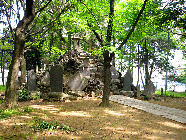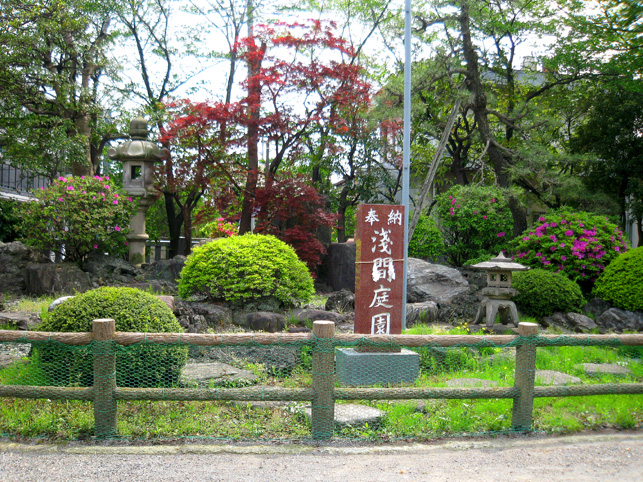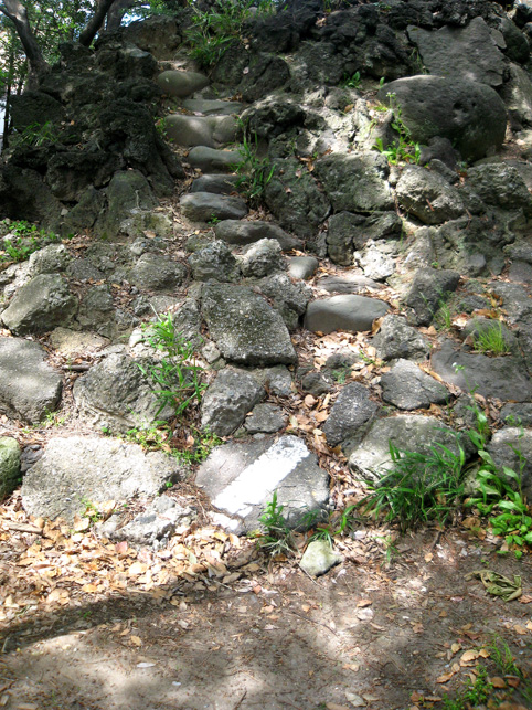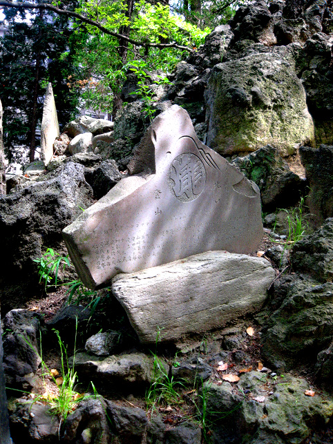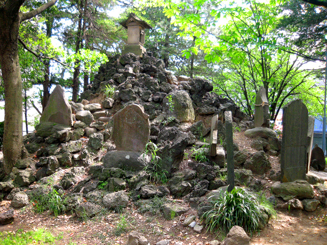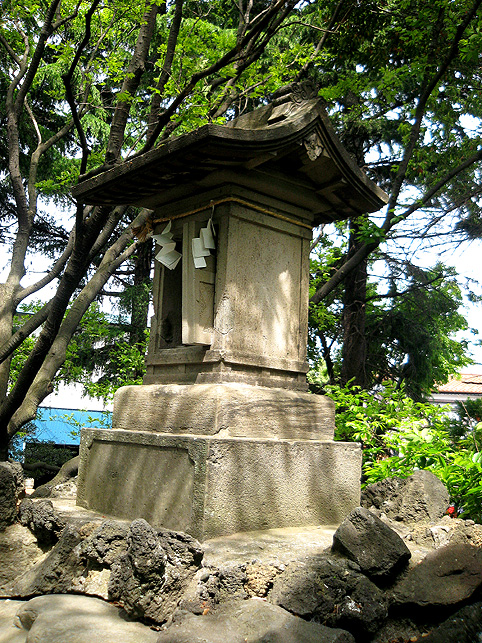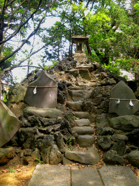 そろそろ移動しよう。講碑の素晴らしさは特筆すべきでしょうが、それ以外のフシギなものはなさそう。とにかくいい場所にあるいい塚でした。では。 と、もう一度正面から登拝しました。下を見るとこんな。 祠は扉が開いていました。 さて、鳥居をくぐって元に戻るか。 草むしりのおっちゃんは、とうとう一度も顔も上げずに作業をしていました。さよなら。 さて、浅間神社と小御嶽神社の間にナゾの「浅間庭園」なるものがありました。 あまり興味がなかったけれど、そのひとつを読んでみると 平成天皇の即位をきっかけにして建てられたというこの碑でちょっとわかりました。 ……当地富士講員が相図り、永年の間富士吉田市の御師大番城様の邸内に先代の方々が奉納された登山記念碑が今般大番城様のご都合により、当浅間神社境内に移設する事になり、並木定男殿の奉納された庭園の完成と同時に移設を完了致しました。就ては古い歴史のある瀬崎富士講社を次の世代に伝える為に之の記念碑を建立せり ふむふむ。てことはたぶんまだ何らかの活動はしてるようですね。これだけの規模の講ですもの。でも、「御師の都合により移設」とは御師が廃業して縁が切れたとか? と思って、以前富士吉田歴史民俗博物館でもらった「御師一覧表」に目を通すと。。。 あったあった。吉田下宿に「大番城」の屋号で御師の名が。平成4年現在の世帯主が(亡)となっているのでたぶん廃業しているのでしょう。それにしてもこの庭園、せっかくあるのに入れないのはちょと残念でした。 それではそれでは〜。