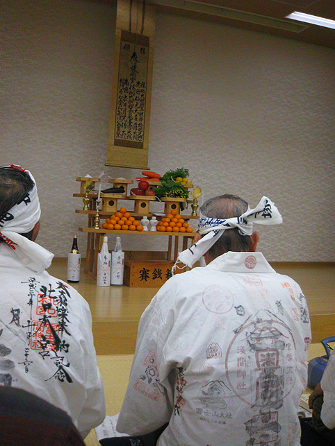 登拝される地元の方々に御神酒をふるまうのは、 奥に見えるのが、 ゴゼンサマ(御神語が書かれた掛け軸)と大日如来碑、奥宮の祠です。 最近、手品の腕を上げたO俣さんが、 「これね〜、『お伝え』なんだけど、こんなこともできる♪」 「えー!早いっすよ」 (Oさんのお兄様は、2代前の先達でした) そうこうしてうちに、富士塚の麓が騒がしくなってきました。 ふと下を覗き込むと、 「人がどんどん集まって来ましたよー。あ!ロウソクの火が消えてる!」 「風が強くて消えちゃったよ〜!」 つづく。。。 Facebook あり〼