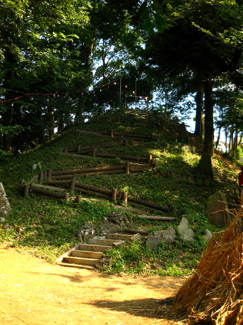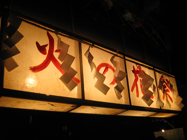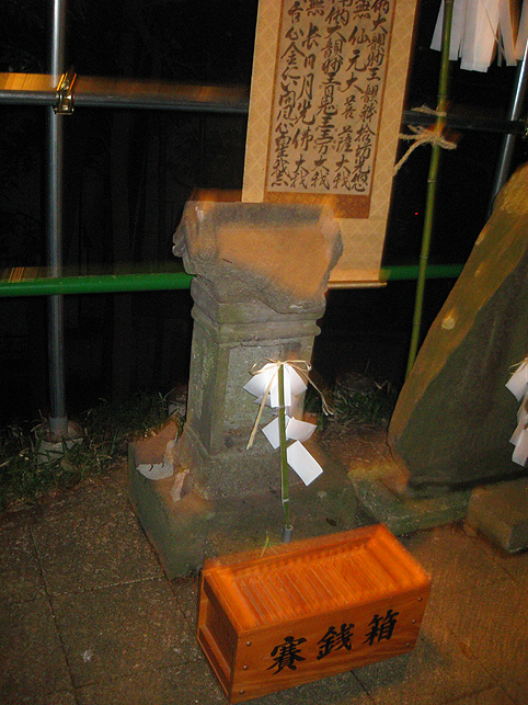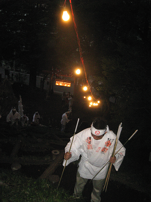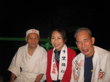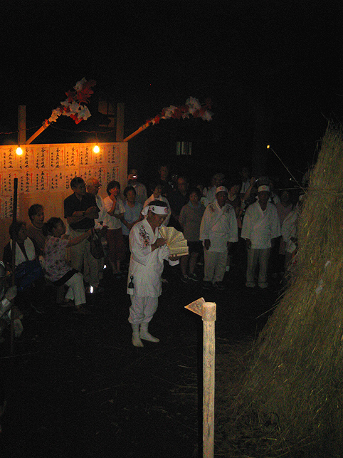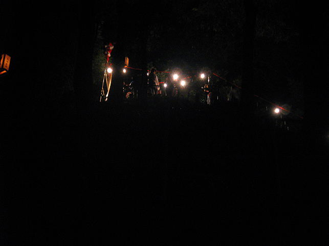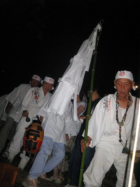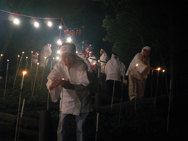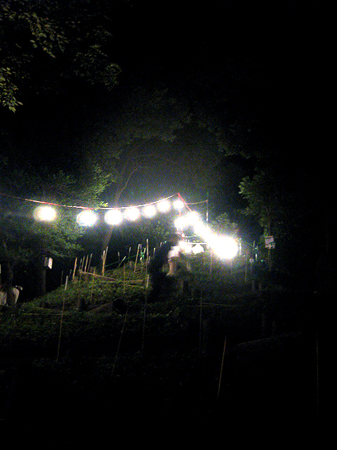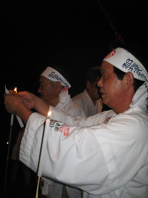 実は、清瀬駅から中里に向かうバスの中で、ここで太鼓を叩くという方と御一緒したのですが、その方がこのちょっと後、やぐらの上でパワフルなドラミングを披露していました。御年配の女性です。バチ持参でカッコイイ♪ 富士塚に戻った6時、中里講社の方々が集まって来られ、祭りの準備が始まりました。これは富士塚一面に取り付ける108本の蝋燭です。 間もなく、頂上で「拝み」が始まりました。 「お伝え」を見せてもらいながら私も唱えます。あれ?今どこだ??? 靴下を通して刺した蚊がニクイ。足の裏に刺されました。 頂上では、掲げたゴゼンサマが晴れやかに見えます。 子供達が覗き込んでいる奥宮の祠と、その右には大日如来。 拝みが終わるとしばらくはのんびり。ちょっと記念撮影などしてなごみます。少しずつ参詣者が登ってきて、ふるまい酒(キッズにはお菓子)が配られます。私もこの手拭いをありがたく首にかけて♪ 「吉田の火祭りでは筒屋さんで御一緒しましたのに、ゆっくりお話できずに残念でございました。あの時、先達の他に何人かはいらしたけど、○○さんや○○さんはいかれなかったんですね?」 「中里からは3人、他は下里からだったんです」 「ああ、なるほど。皆さんいつもは上文司さんのところにお泊まりなんですよね」 「そうそう。必ず上文司なんだけど、今年は宿の都合で筒屋に移ったんですよ〜。」 実際はこんなに暗くはないけれど、夜に包まれた中里の富士山は徐々に幻想的になってきました。 そして、蝋燭に火がともされ。。。 講の皆さんは出番を待ちます。 「盆踊りが『炭坑節』になったらそろそろだ。みんなこっちに移動してくるよ。」 つづく。。。