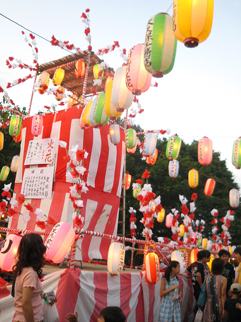 「火の花祭り」は、午後6時頃から富士講の方たちが中里富士に集まり、儀式を行ないますが、10分前になっても静かな富士塚だったので、ちょっとだけ、そこから目と鼻の先にある盆踊り会場へ行ってみることにしました。