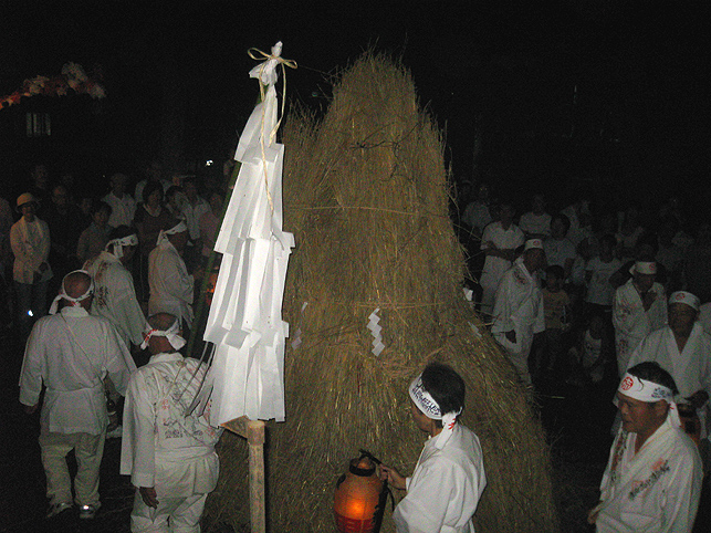 時計を見れば、ちょうど9時。 先達を先頭に、講員が「掛け念仏」を唱えながら、下山を始めます。 掛け念仏は、バランスを考慮して、前半分・後半分を交互に唱えられるように並びます。 地上に下りました。麦藁でできた大松明のまわりを、右回りに3回まわります。 先達が大幣束(大麻 おおぬさ)を振りかざし、「四方固め」の形でお祓いをします。 正面→左側→裏側→右側→正面の5箇所です。 そして、火を招くためのいくつかの儀式が始まります。四方固めにて両手を使って「火の道を開く」所作や、 経本仕立てのお伝えをパラパラと開き、火に向かって「言霊を投じる」。鮮やかです! 待ちに待った「点火」。 そして、参加者に向けてお祓いが始まります。位置は四方固めにのっとって。 今年は火のまわりがとても早い。松明は巨大な生き物のように燃え上がり、人々に襲いかかるようでした。すごい迫力でした。強風が吹いたのと、松明がふんわりしていた(麦の量が少なかった)からです。自然を相手のことですから、火の表情は毎年違います。 この後、講中が再び掛け念仏を唱えながら登拝を始めると、群集はスコップとバケツを手に、松明の燃えカスに突進します。 昨年の様子はコチラです♪ そして、一瞬にして静寂が戻って来ます。 富士塚を仰げば、そこには森の中に吸い込まれそうな幻想的な光景が! 今年はまた、ひと味違った気持ちでお焚き上げに立ち会うことができました。ありがとうございました♪ 後片付けをし、先達のお宅へと向かいます。荷物は車で運びますが、私は講の方たちと歩きます。これが、とても気持ちのいい数分間なのです。 「この向こうに川があってね。。。」 「自分が生まれた家はそこでさ。。。」 お話を聞きながらのんびりと「夜道の散策」です。 先達のお宅で直会です。 床の間には、今まで使った大幣束が立て掛けてあって、その多さに驚きました。 心づくしの手料理に感謝しっぱなしでありました。本当に美味しい。 「では、また来年ね♪」 そんな言葉をかけられた私の心にも、火が灯ったのでした。うるうる。