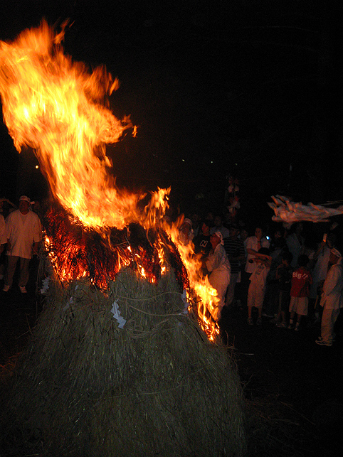「何時になった?」 「9時10分前です」 「炭坑節聞こえるよね?」 「あ、はい。予定よりちょっと早いですね」 いつも9時頃に聞こえてくる盆踊りの炭坑節は、お焚き上げスタートの目安です。 頂上のライトをはじめ、提灯の灯もすべて消された闇の中、 富士講の方たちが掛念仏しながら下山して、いよいよ儀式が始まりました。 四方固め、大松明の点火の後、O俣さんによるお伝えの転読。 そしていつものように、大幣束を振りかざして参列者をお祓いしました。 きれいに燃え上がるよう、またすぐに崩れ落ちないよう、位置を確認しながら点火したので、 火のついた小麦の富士は、火山のように燃え上がりました。 上部の燃え方が均等になり、ギザギザなカタチが美しい。 麦藁の束ね方は、こんなふうになってます。 小麦富士は、あっという間にマグマに変貌! 上の画像の3分後とは思えないほど。 今年の燃え方は、特に豪快。顔が熱くて皆悲鳴を上げてました! そして、まだ熱い燠を皆で掻き集め始めると、富士講員は帰頂し、 最後に〆の拝礼です。 大仕事を終えホッとするO俣さん。お疲れさまでした。 地口行灯の美しい絵が、疲れを癒してくれるようです。 この後は、新先達M村さん宅で直会があり、私もご挨拶で参加させていただきました。 夜道を歩きながら、 「これが小麦の畑だよ。だいたい100坪あるね」 と、大松明に使う小麦の畑(前の先達所有)を見せていただいたり、 「今度は、ここ(Mさんの土地)で小麦畑を作るんだ」と説明を受けたり。 M村さんのお宅も、驚くほど立派なお屋敷でした。 写真は撮りませんでしたが、直会の様子はほぼ前先達のお宅と同じ。 やはりたくさんのご馳走をいただきました。おいしかった〜♪ 皆様、本当にお世話になりました。ありがとうございました! Facebook あり〼