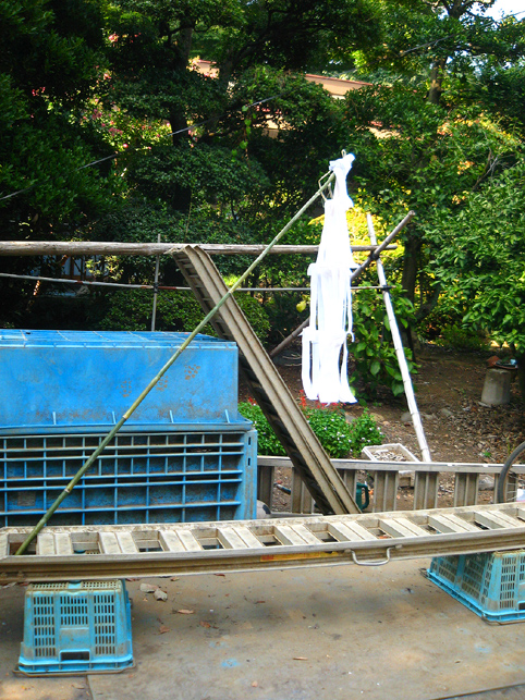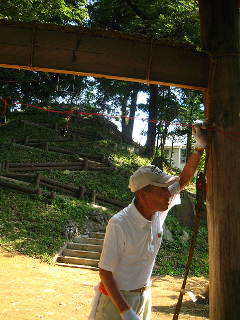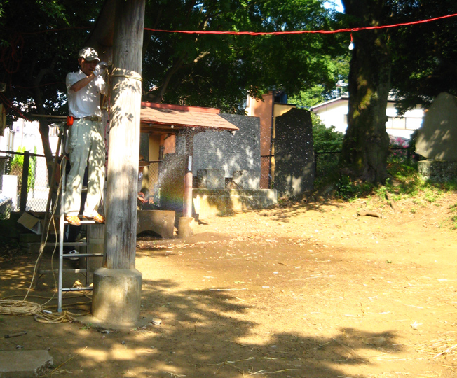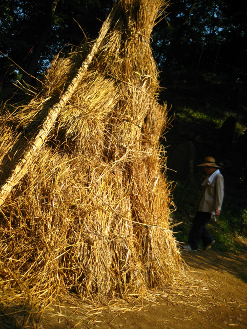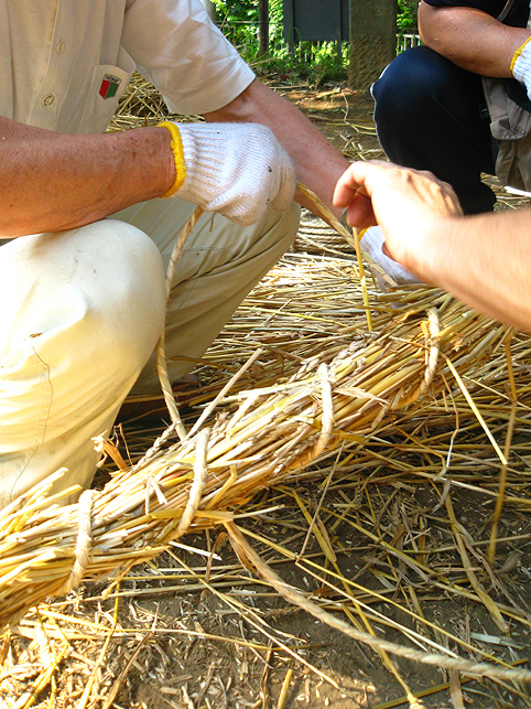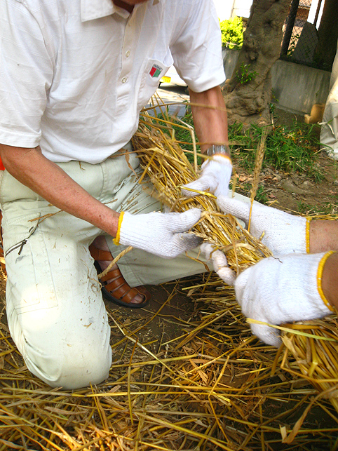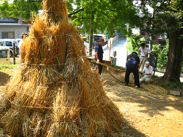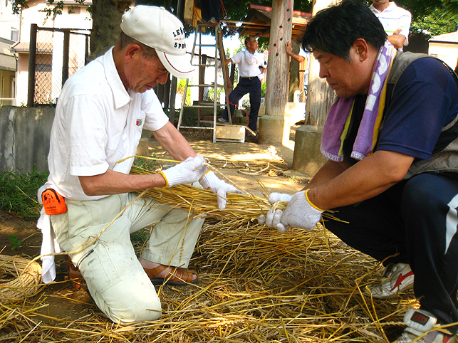 電気代がもったいないのと、室外機から熱を放出することがどうもイヤなので、先月はトータルで1時間しかクーラーをつけずに頑張りました。しかし、無駄な努力はしちゃぁいけませんね。ムリして体調崩し、結局、ケチッた電気代以上の医療費がかかってしまいました。節約したハズの電気代もあまり抑えられず、とほほです(笑)。 とにかく9月になってもこう暑いとは〜。 昨年の9月1日は、長袖シャツを着て出かけたことを思い出して驚きました。 「午後2時くらい? だったら富士山にいるよ。準備してるからおいで」 Mさんからの電話で、いそいそと出かけました。 富士山神社を目指し、太陽がギラギラ照りつける道を行くと、 ええ〜!? もう麦藁富士が燃えている??? そう錯覚するくらい頭クラクラ。喉カラカラ。 あわててペットボトルの水を飲みました。 中里富士のある富士山神社に着くと、富士講の方達が汗だくで作業していました。 「おう。祭りの裏側見ていきな♪」 「今作っているのは?」 「点火棒よ」 麦藁を束ねて〜。 そんで、縄で巻く。 このへん弱いな。もっと足すか。 太くするには、少しずつ藁を中に刺してって〜。 ほれ。こんくらい長くしないと、てっぺんに届かない。 麦藁富士はもう仕上がっていました。 なるほどね〜。夜しか見たことなかったから、構造がよくわからなかったけど、麦藁の束をいくつも作ってからそれを円錐状に積み上げて、最後に縄を巻いて整えるんですね! 麦の穂はついたまま。 「ホントはね、穂は全部取ってからのほうがいいんだけど」 「たしか、『ぼうち』で?」 「そうそう。棒で打って穂を落とすから『ぼうち』」 「大変な作業ですよね」 「これ(祭り)やるのに畑が必要だからね。そろそろ蒔きどきだよ」 「そうか〜。この麦の粒を蒔くわけですね」 「うん。ここらに落ちた麦も全部拾っておかないと芽が出てくるよ」 木陰に腰掛けて、先達の御子息がいろいろと教えてくださいました。 この辺は麦がとれたから、昔は藁葺き屋根の家ばっかりだったそうです。 「茅(かや)がとれるところは茅葺き屋根だね。茅もいいんだよなぁ〜」 「棒ができたよ〜」 長さを確認しながらリハーサル。 向こう側には、寄附を貼り出す札場(ふだば)も設置されてました。 「お〜い。次はこっち。注連縄だ」 点火棒と同じ要領で作ります。ギシギシ。マキマキ。 古い注連縄を降ろして、長さを確認。それを鳥居に取りつければもうおしまい。 心地よい涼風が吹いてきました。「ひゃ〜気持ちいい♪」 手水場の水道から水を撒き始めたら、一気に涼しくなりました。 地面が冷えるとやっぱり違うのね。レインボウが目に嬉しい。 富士塚を照らす電球も、点灯テストが終わり、富士山はしばらくひっそりと夜を待ちます。 一方、先達のお宅では、他のメンバーが他の品々を点検中でした。 手前の竹は蝋燭を刺すためのもの。計108本。 「賽銭箱がどうしたって?」 「寄せ木の一部が突っかかって」 「棟梁に直してもらいなよ〜」 宮大工の棟梁(こだわりの角刈りが◎)が登場し、即解決しました♪ 傍には、お焚き上げの際に振る大御幣が準備されていました。 先達宅の中庭には「正しい夏の心地よさ」があります。 風が通り抜ける。木々は守ってくれる。汗がひく。 ここでは夏を嫌いにならないな。 この日、卒論に富士講(富士塚)を書くという学生さんに会いました。 先日も、そんな人に出会いました。それぞれ、専門分野もフォーカスする点も違いますが、何だか嬉しくなりますね〜♪