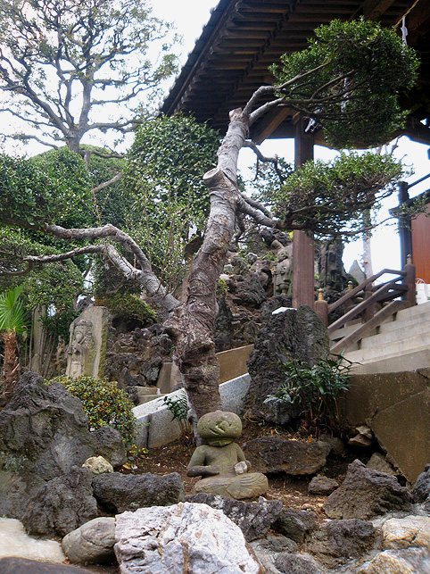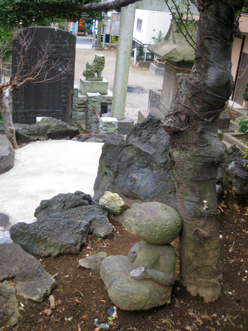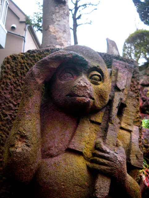 いろいろ観察しているつもりでも、やっぱりそうです。 前回ここに来た時は夏だったから、塚の裏は草に覆われていて、まわり込むことはできませんでした。新年を迎え、氏子中が丁寧に植木の剪定と塚の掃除をしたらしく、富士塚はとてもすっきり。お中道を歩くことができました。 まあ、それは想定できる範囲です。でも、仰天だったのはコレ。塚の横で見つけました。 メントスキャンディのCMのキャラのような丸いアタマはなんだ??? こんなでした。背後の富士塚がよく見えますね? 私はてっきり「大日如来」だと思いました。富士塚でしばしば目にするからです。首なしの大日如来に、石造りの柱の先端の擬宝珠(ぎぼし/ぎぼうしゅ)を誰かが乗せたのだ。そう思いました。 でも、「印相」といって手の形が違う。大日如来にしては、左右の手が離れ過ぎてるのです。 大日如来が結ぶ印は、金剛界と胎蔵界では形が違う(前者は智拳印、後者は法界定印)けど、このメントス像はそのどちらでもない。では、この仏さんは。。。誰なんだ!? 右手に何か持っていたような手の形、腕を引いた位置、等からして、やはりこちらも富士塚でよく出会える「不動明王」かしら。。。 まあとにかく、こちらに訪れた方はこの像を動かさないようにしましょう。どういういきさつでこうなったかわかりませんが、ナゾのものにも理由があります。手に触れないことが大切です。 ↑左端にいるヤツです。 ガーゴイルってこんな感じ↓ ノートルダム寺院のガーゴイルが有名ですね。中世以降の建築物の上部にたくさんつけられています。魔物や獣の姿をした雨水の排水口なんですが、魔除けとして考えられていることもあり、守護的存在でしょうか。私もこの(頬づえついてる)彫像の隣で、同じポーズで写真を撮ったことがあります。惹かれる存在です。 ちなみに、ガーゴイルとは、フランス語のgargouille(喉)に由来した言葉で、水がゴボゴボと流れ出る音を表わすラテン語garからきています。英語のgargle(うがい)も関係あるんじゃないかな。 まあ、上の写真の富士塚のほうは違うんですけどね。このアングルからだとちょっとガーゴイルに見えませんか? では、これに近づいてみましょう。なかなかのキャラです。 |