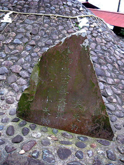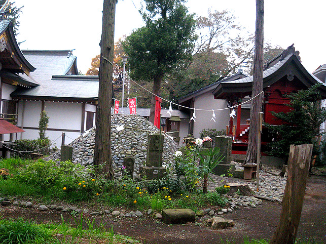 榎が丘にあった富士塚から移された石碑は3つです。 元の塚にもこれらしかなかったようですが、その3つとは。。。 です。実際の富士山の方角に向かって、「タテカワ元講」の碑を中心に 左に「御室仙元大菩薩」、右に「里社仙元大菩薩」が並んでいます。 タテカワ講の紋は、「山」の下に「丸」があってその中に「川」を表わすタテの三本線。 ところが、 ちょっと離れたところに別の紋を発見! があったのです。これは、隣の稲荷神社の脇でした。 違う講のものがひとつの富士塚につけられることはよくありますが、 以前、榎が丘にあった富士塚には3つの石碑しかなかったのだから、 これは移築の際に別の富士塚から持って来られたと考えられるわけです。 で、「山富講」の造った富士塚を調べてみたら。。。 榎が丘から少し北にあった、かつての「恩田富士」通称「六角富士」に この水盤があったことがわかりました。 さらに、ここに運ばれたものは、水盤だけでなく、 またその近くに置かれた石祠もおそらく六角富士からのものの可能性あり。 面白いですね〜♪ 解散した複数の富士講の残した富士塚を、移築の際にまとめてしまうってコト、 あったんですね。 ちなみに、かつての恩田富士がなぜ六角富士と呼ばれていたかはナゾです。 いつか地元の方にお聞きしてみたいところであります。