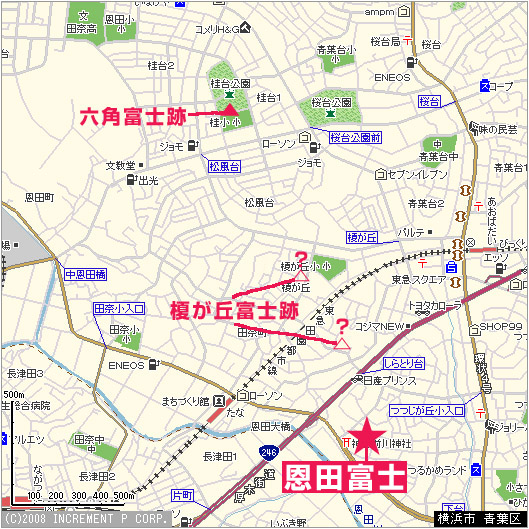 神鳥前川神社にある「恩田富士」は、近くから移されてきたものです。 恩田富士の前身は、マップの中に記した「榎が丘富士」です。 今はもうないので「恩田富士跡」が正しいのでしょうが、 ちょっと疑問も残るので、保留の意味で、曖昧に榎が丘富士としておきます。 まず、榎が丘富士の位置ですが、場所の特定がちょっと曖昧なのです。 246のすぐ近くにあったということは、文献や地元の方によるものですが、 榎が丘という地名からは、もうちょっと離れた場所ともとれます。 土地感のない私には断定できないので、保留であります。。。 もうひとつ。 現在の恩田富士にある石碑を観察してみたところ、 榎が丘富士からだけでなく、もうちょっと離れた「通称・六角富士」からも いくつかの石碑が運ばれた可能性が出てきたのでした。 つづく。。。