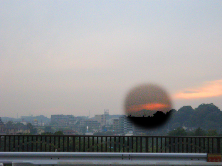 hozhoさんのご指摘のおかげで、榎が丘富士(下恩田富士)の 位置がわかってすっきりしました!ありがとうございます。 ところで、この富士塚にはさすがに登拝はできませんね〜。 形状の問題でなく、塚にぐるりと注連縄が張ってあるからです。 富士塚めぐりにも、こういう神域のボーダーには配慮が大切、 絶対無視してはいけないことですね。 富士塚の手前にも、神垂(しで)が揺れる注連縄(しめなわ)があります。 これは、2本の木の幹から張られたもので、神域のカタチ。 鳥居として受けとめましょう。 では、このアングルをもうちょっと検証してみまっす♪ 引いて見ると、こんな感じの位置関係です。 木が作る鳥居は、ほぼ、富士山の方角を向いているのでした。 神社の方にも確認しましたが、土地感のない私でも方角がわかったのは、 このおかげでした。(オレンジ色の★は私が画像につけました) この日、恩田富士に行く前、青葉区で「散策しながら地図作り」をされている サークルの方たちにお会いして(青葉区民まつりにて)、富士塚の存在や、 富士山の見えるスポット等、教えていただいたのでした。 富士塚の他に、大山街道や大山の見方も聞いていたおかげで、 この神社を下りたところで、大山がどれか認識できた次第です。 横浜の方には、大山は馴染みの姿のようですが、私は初めてでした♪ 画像加工は、大山だけをクリアに見せるため。 (実際はこんなに暗くはなかったです) あれれ!? アップしてから気がついた! 大山の右上に、 富士山の頭が見えているじゃぁありませんか〜〜〜♪