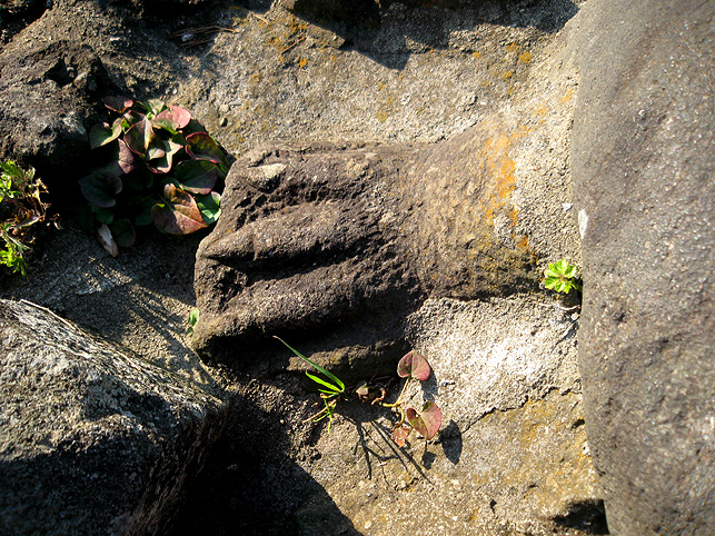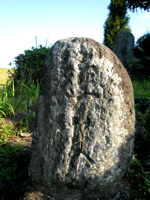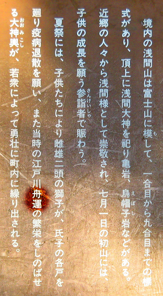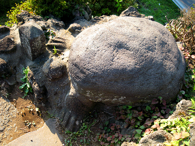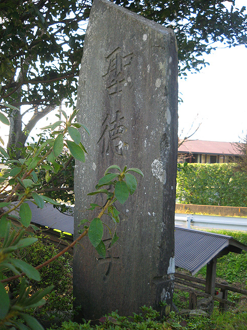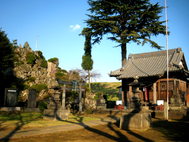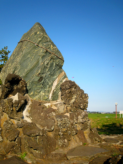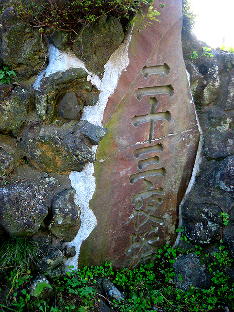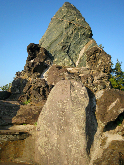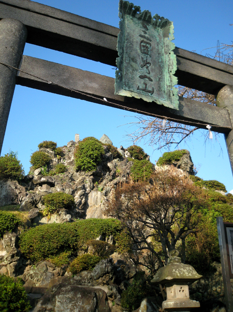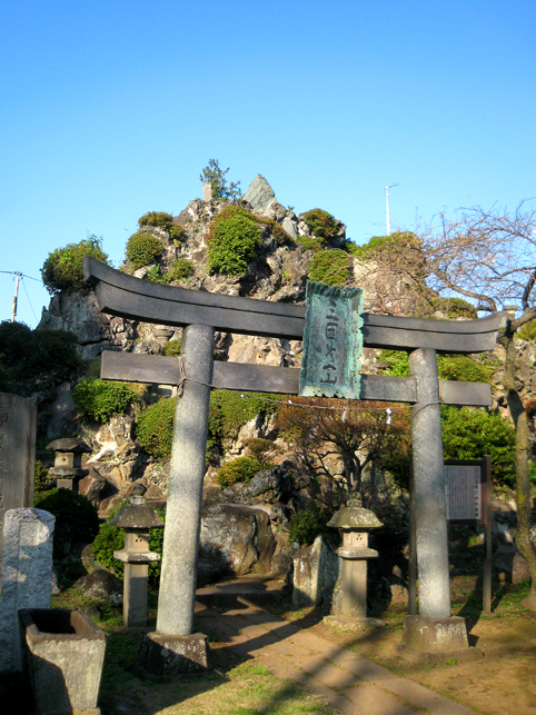 浅間大神の石碑のまわりは、ゆとりがあるものの、引いて撮るのは困難です。 頂上からは、背後の土手がこんな風に見えます。そうだ、裏から見てみよう! いい形の富士塚です。 頂上の石碑がきれいなシルエットとなり、印象深い光景です。 まだ日が高いのに暗く見えるのは、西日を受けて逆光だから。 そう。この塚は、富士山の方角を向いています。 塚の裏側も、よく見ると幾重にも道があり、たくさんの石碑が置かれています。 塚から土手へは、こんな風に続いています。 魚勝さんで買ったのりまきをほおばりながら、しばし風に吹かれたりして。 抜けるような青い空、気持ちいい〜! 川原で凧上げをしている人もいます。 では、再び塚に戻ります。 高さは約9m。太陽をいっぱい浴びて美しい富士塚です。 ここの鳥居には こんな扁額がかかっています。「三国第一山」とは富士山のことであります。 富士信仰の歴史に重要な存在だった、小谷三志の書いた文字を型どったものです。 この富士塚の目玉でもあります。 ゆるやかな登山道をゆくと、すぐ左側に聖徳太子の碑があります。 聖徳太子のことは、以前ちょこっと紹介しましたが、こうして石碑にあるのは 珍しいです。 折り返して、右へ登って行きます。富士講に関係ないようなものもありますが、 道は続きます。 そうそう、この富士塚の特徴のひとつ、合目の道標は御神燈に刻まれたものです。 そして、頂上手前にある。。。 頂上はかなり広い。浅間大神碑のまわりをぐるりと廻れるほどです。 でも、この塚で最もユニークなものが、烏帽子岩の手前にありました! つづく。。。