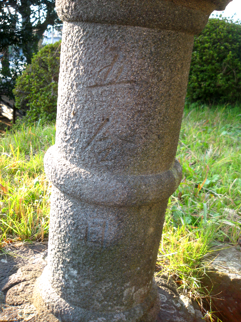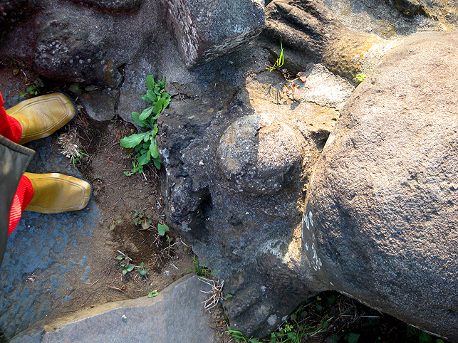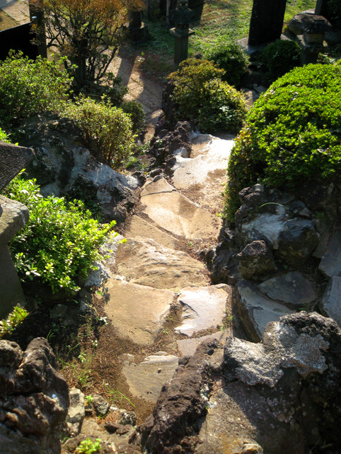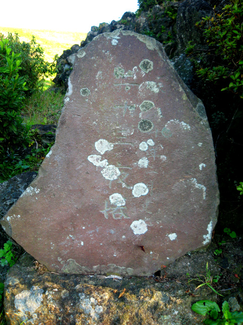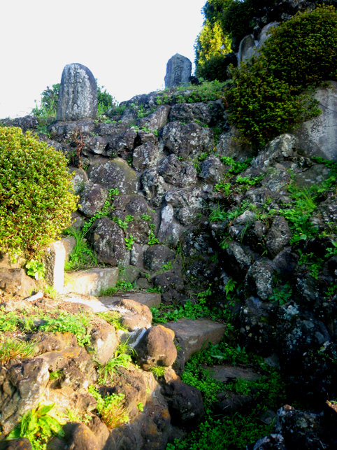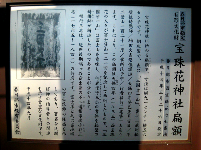 熱中時間のひとコマ。 日が暮れるまで頂上にいる私が映っていましたが、実は、地上から見上げた定点カメラも長時間私を追っていました。撮った映像を早回しにしたら、巨大な富士塚を登り降りする私の様子が面白かったのですが。。。 さて、この西宝珠花富士は、本には掲載せず見取り図も記録がなかったので、ロケの日に登拝しながらメモしていました。ところが下山してみると、 地域の方たちが待っていて、嬉しそうに私に見せてくれたのです。 「こんなのがあるんです」 「ひぇ〜!何ですかコレ♪」 そこには、この富士塚に乗っている全ての石造物の調査報告が記されていました。図版もあり。 立教大学の学生さん達による調査報告書でした。学芸員課の。 ふたつ前の見取り図はその中の一枚だったわけです。すごいや。サスガ! もちろんこれは非売品ですが、地元の方の御好意により、しばらく拝借しております。感謝です! いろんな石造物があるわけですが、地元の自慢はなんと言ってもこの歌碑。 中腹の登山道脇にある、板東三津五郎の歌です。 「釈尊も納受まします 宝珠華(花) 女人ものぼる 江戸川の不二(富士)」 実際は、文字が摩滅していてとても読めなかったので、これは有り難い!
