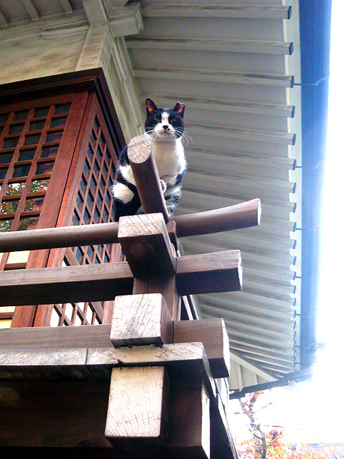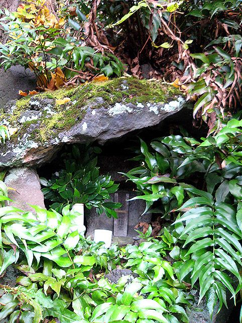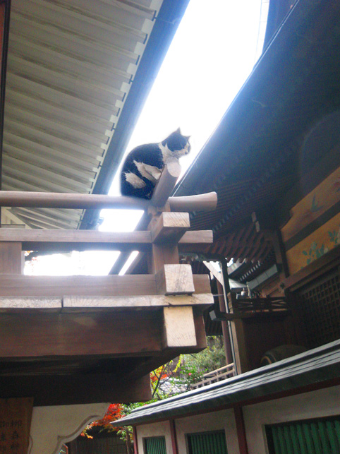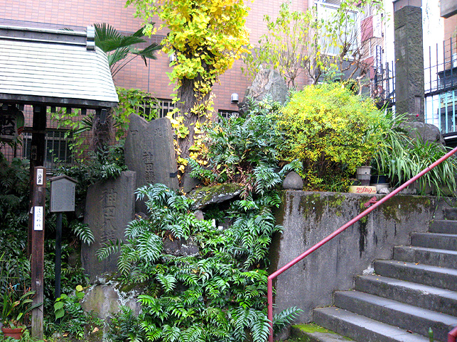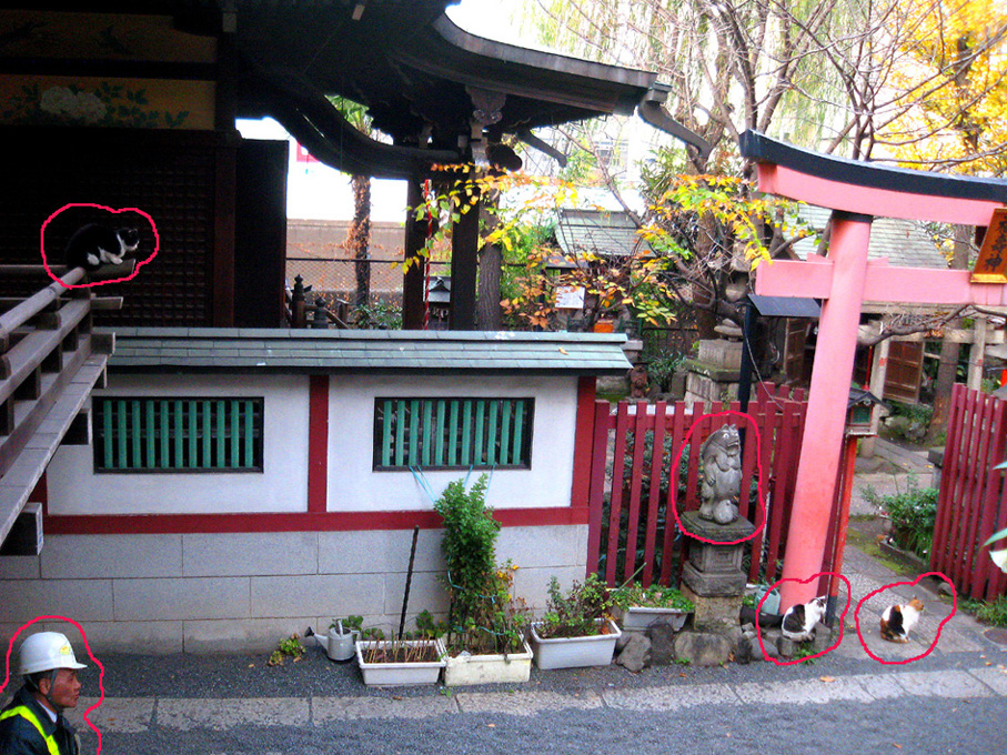 真っ先に目に入るこの狸像が異彩を放っているからでしょう。 猫も、どことなくコイツにだけは一目置いているみたいです。 それでも手下のつもりだけど。 境内には、神楽殿や本殿の他に、いくつもの小さな神社があります。 でも、それらは省略し。。。こちらが手水舎。右手前が富士塚です。 石段を降りてふり返り、富士塚を見たところ。 富士塚というか、塚の残骸というか。まあ、カタチはどうあれこの石段の 左側、隅っこが富士塚です。 猫は気まぐれに歩き回り、すでに石段に陣取って毛づくろいをしている。 通りから、鳥居をくぐって人が続々とやって来ます。 まるでここに吸い込まれるように。 ほとんどが、神楽殿横にある灰皿で喫煙するビジネスピーポーです。 最初、休憩時間にお参りしに来てるのかと思ったけど、そうではなかった。 まして富士塚に興味ある人はいないようです。 彼らは、タバコ片手に携帯チェック。 でなければ、お参りに余念のない少女や、富士塚に見入る私を 珍しそうに見ているだけ。 猫たち、狸たち、狐(稲荷神社なので)たち、富士塚、 ビジネススモーカーたち、ひたすらお祈りする少女、 そして私。 これらが、せまい境内に共存するという不可思議さ。 その境内は何でも飲み込む異次元か。(笑) 猫は皆、貫禄ある老猫で、ケンカの証も勲章のようでした。 つづく。 |