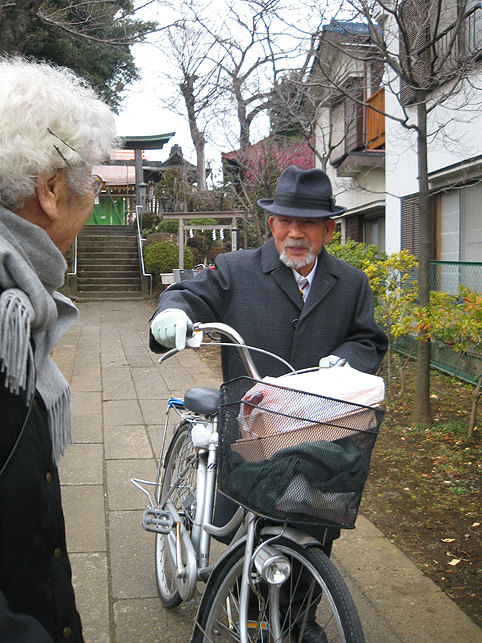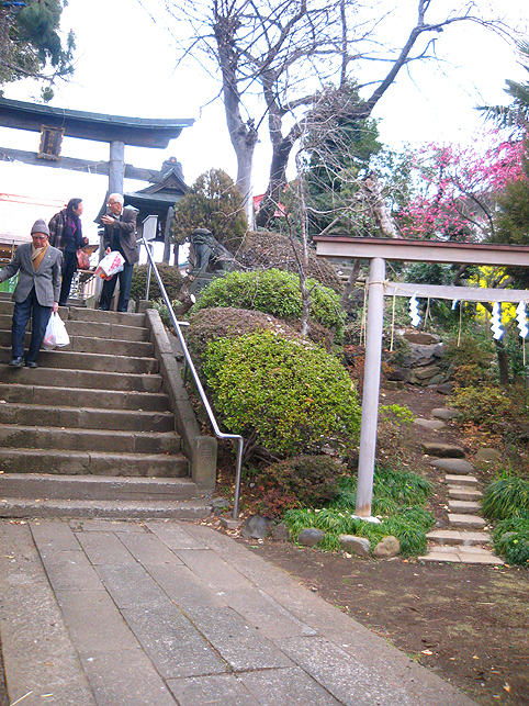 せっかくなので、そこも訪れることにしました。進路は西。 目的地近くなったら見当をつけて歩きます。地図は仕舞って。 それは、この瞬間がたまらなく好きだからです。 「きっとあそこだ!あの高い木々のあたりに違いないっ♪」 そう確信すると、足取りは軽くなります。 道を回りこんで、大松氷川神社に到着すると、いいタイミングにご年配の方々が出てきました。皆、手にお弁当の包みを下げているところを見ると、新年会のような。 とびきり「お洒落オーラ」を放つ紳士がひとり。目立っていましたよ♪ 参道を進むと、氷川神社への石段と右側にも石段が。。。ああ、あれが富士塚? 集会所から出て来た人達は楽しそうでした。 会話をしているふたりにフキダシをつけるとしたら、 「野沢さんが髪を切ったって?」 「違うよ。野沢菜が噛みきれないって言ったんだ」 とか? |