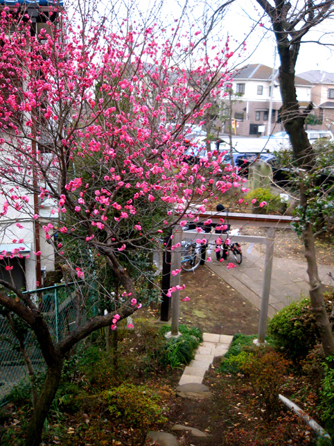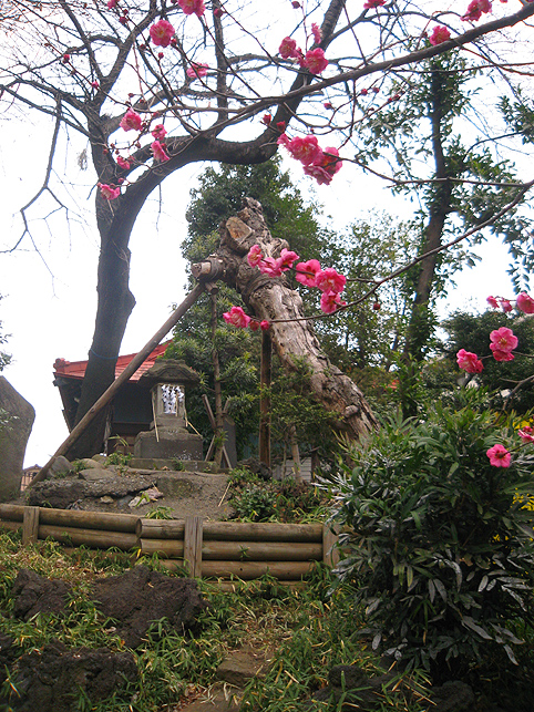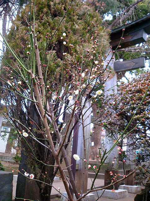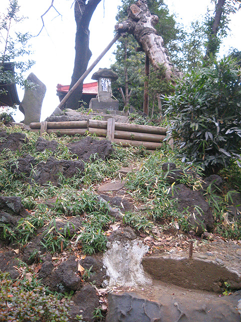 前の記事の奇妙な溶岩は、踏み石にしては不自然な位置。 ここから絶壁のごとく勾配がかかっていました。 また、その石の上に、これまた不自然な鉄の棒がセメントから 伸びている。これは明らかに、何かを乗せるための芯棒の残骸です。 (画像の手前側にあるのがそうです) 後日、この富士塚の古い写真を確認したら、やはりこの ヘンな溶岩の上には、石碑が建っていました。 でも、その石碑はここにはもうない。 右にはこの水盤と講碑。 左を向けば、鈴原神社の碑。 その上にこれ。 さらに上にはこれ。このへんはかなりの勾配です。 登るべき斜面でないことはわかりますが。 そして、頂上に奥宮の石祠。 奥宮の手前から下界を望むとこんなでした。 この富士は、崇めるよりも見下ろすほうが味がある。 そう思いました。 ここには、紅梅だけでなく、白梅もあります。 この「味のある」狛犬のすぐ背後でした。 この富士塚は、地域の方と区によって、保存されているようです。 練馬の大松氷川神社でした。