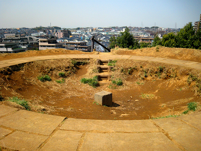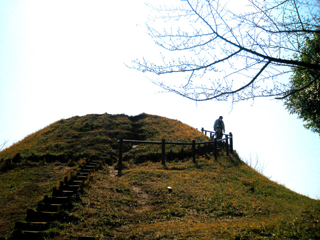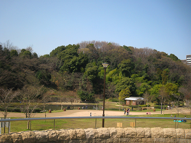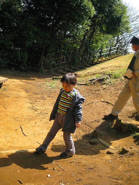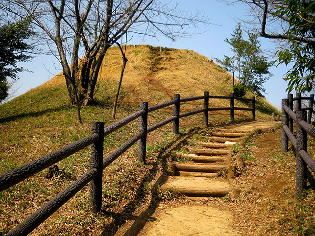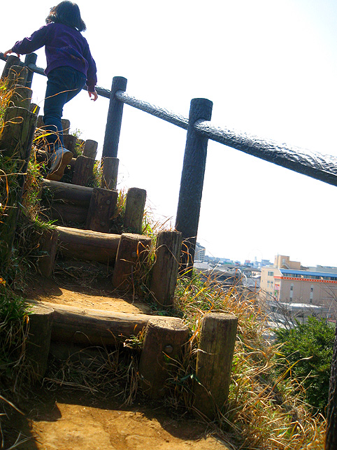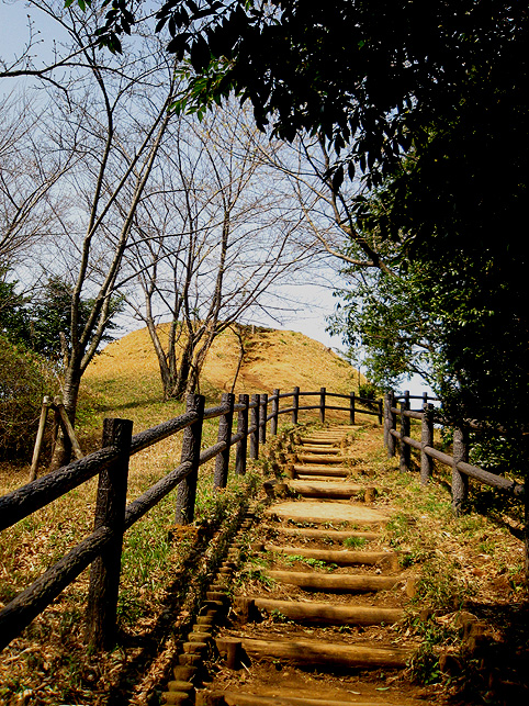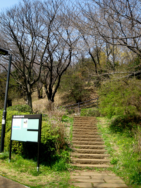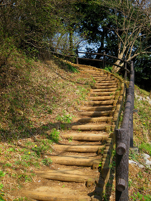 よく見えないようになっていますが、実は、南側の麓から登山道もついています。かなりの急勾配なので、散歩で訪れる一般の方は登らないで下さいね。 斜面には、木の根元に仏像や石碑が置かれているのがわかります。 いくつかの仏像と違って、これは和服を着ています。身禄様ではないでしょうか。 横浜の富士塚に多い、○○大権現の石碑。かなりの数があります。 こちらは、台座に山真講の文字です。頂上の火口の中にあった山真講のものです。この富士塚を造った富士講と言われています。 胎内も造られていた山田富士です。胎内があったと思われるところは崩落したまま。その近くに仏像が置かれていました。胎内に祀られていた大日如来像では?下の歩道からもよく見えました。 傍らには椿? 春ですね♪ 下から仰ぐと頂上もよく見えます。 やはりかなりの大きさです。 ちなみに、富士塚の背後はもっと大きな丘が続いていて、森の中を歩くことができます。これは北側の登山口から登って山田富士に下りてきたところ。ちょっとドラマチックな光景でした。 看板(傷だらけ)にあった上空からの写真です。黒々としているのが公園の森。左側に頂上のお鉢がくっきり! なかなか歩きがいのあるところでした。やはり歩いてみないと地形はわからないものです。