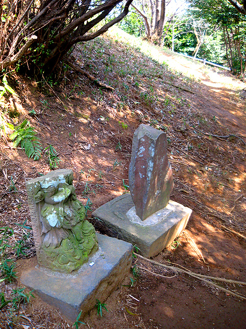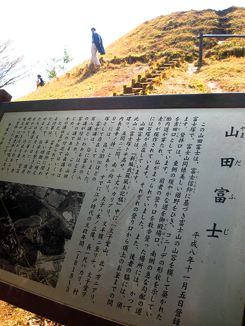 と思ったら、 登る人達と向き合いました。お互い、孫を連れてます。 下山組は直線コースから下りて来ました。 看板もあります。 では私も登拝します。 手すり越しに町が見えますね。かなり高い。 頂上は「お鉢めぐり」と言われる構造です。 中心にはこうして富士講の証が見られます。 でも、なかなか文字を読む人はいませんね。下の看板に書かれてあるのですが。 頂上には、家族連れの登拝者が多いです。ご近所から散歩がてらに来ている様子。まあ、これを富士山と呼ぶことはあっても、富士講の産物とは9割の人が知らないでしょうね。それはいいとして、頂上で遭遇した白人家族の会話、 「ダディ、この山どのくらい古いのかな?」 「どうせ10年そこらだろ」 「ふうん」。。。 おーまいがっ!そこのパパ、ダメですね〜。(友人同士の軽口ならまだしも)親なんだから、知らないのに子供にいいかげんなこと言っちゃダメよ。 私はよほどコメントしようとしました。でもまあ家族平和な散歩のひとときです。親のメンツもあるでしょうし、歴史や文化に興味なさそうな人だったこともあり、やり過ごしました。でも、子供がせっかく興味示したのに残念です。私がその子の親だったらこう言うでしょう。 「う〜ん。わからない。じゃあ、一緒に調べてみよう♪」とね。 さて、この山田富士はこの姿だけが注目されがちですが、実はそれだけではありません。 お中道を行けば、 石造物に出会います。 山中講の文字。そして、左の仏像はディテールが素晴らしい。 数珠と足の表現が特徴です。 つづく。 |