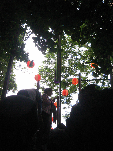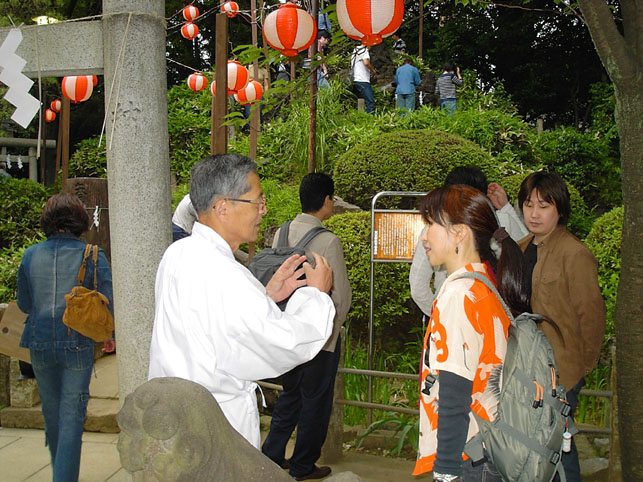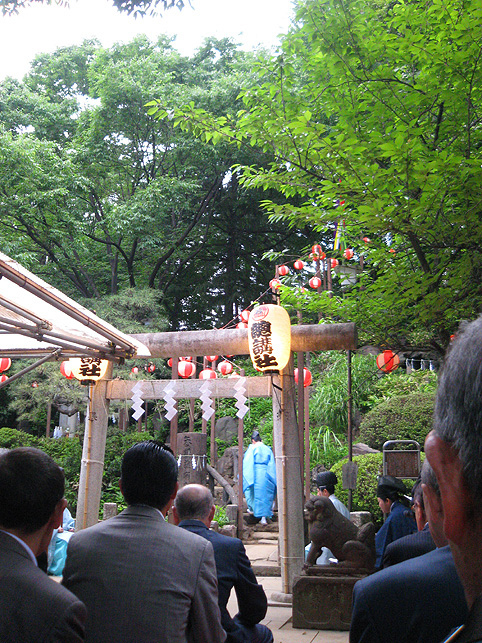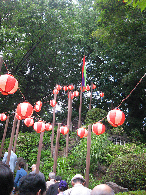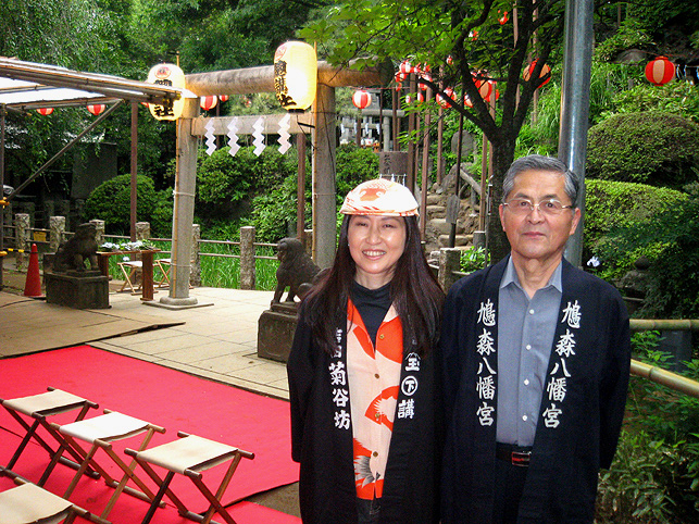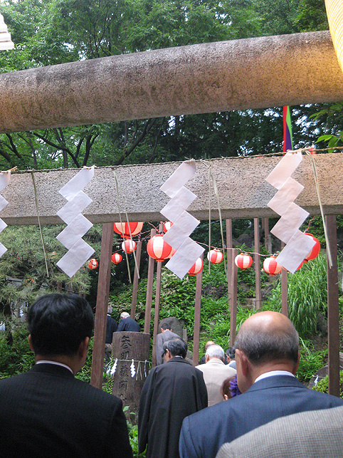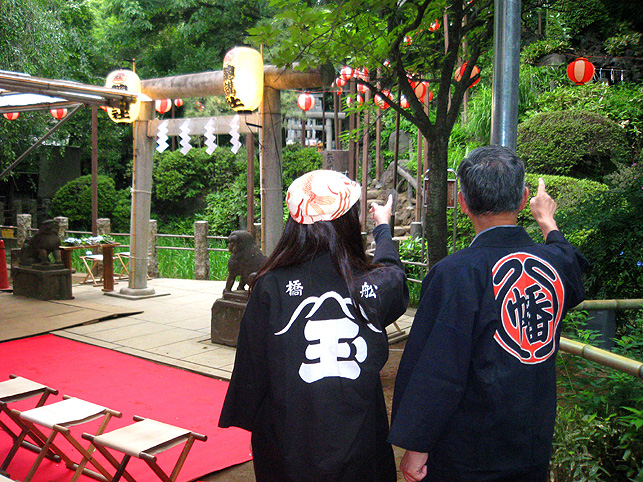 鳩森八幡です。今年は何だか静かな境内。 提灯に明りが灯りました。儀式は午後5時から。 私はこちらの氏子でないのですが、 (「ご近所富士山」の執筆の際、お世話になった)宮司さんにご挨拶したら「せっかくだから、玉串奉奠(たまぐしほうてん)に参加してってくださいよ〜」と言われ、「それでは喜んで♪」とちゃっかり。(ちなみに宮司さんは平岩弓枝さんの義理のご兄弟なのです) 神官に続き、区議会議員さん、氏子さんらがぞろぞろと。。。 頂上に向かって鮮やかな提灯が飾られています。 玉串奉奠は、正面の石橋を渡って左の里宮にお供えし、すぐ下山しますが、 その後の一般登拝では、里宮の横を歩き、裏側から頂上へと登って正面に下ります。 裏の小御嶽わきから急な斜面を行くところです。 奥宮に向かって手を合わせる女性が見えます。 コントラストを効かせたのでわかりにくくなりましたが、左側にとても大きなオーブが写ってます。富士塚は、こうして大勢の方にお参りされるとメッセージを送ってくるのです。ちなみに、私の背後には樹齢400年の御神木が立ち、この塚を覆っています。 ちょうど持ち合わせていた富士講の法被を着て、神社の方とポーズを取ってみました。 私の隣のOさんも、個展を開く画家であります。 これは、2年前の私とOさん。なんと、私は同じ和風アロハを着ていたんですね〜。 ★★★★★★★★★★★★★★★★★★★★★★★★