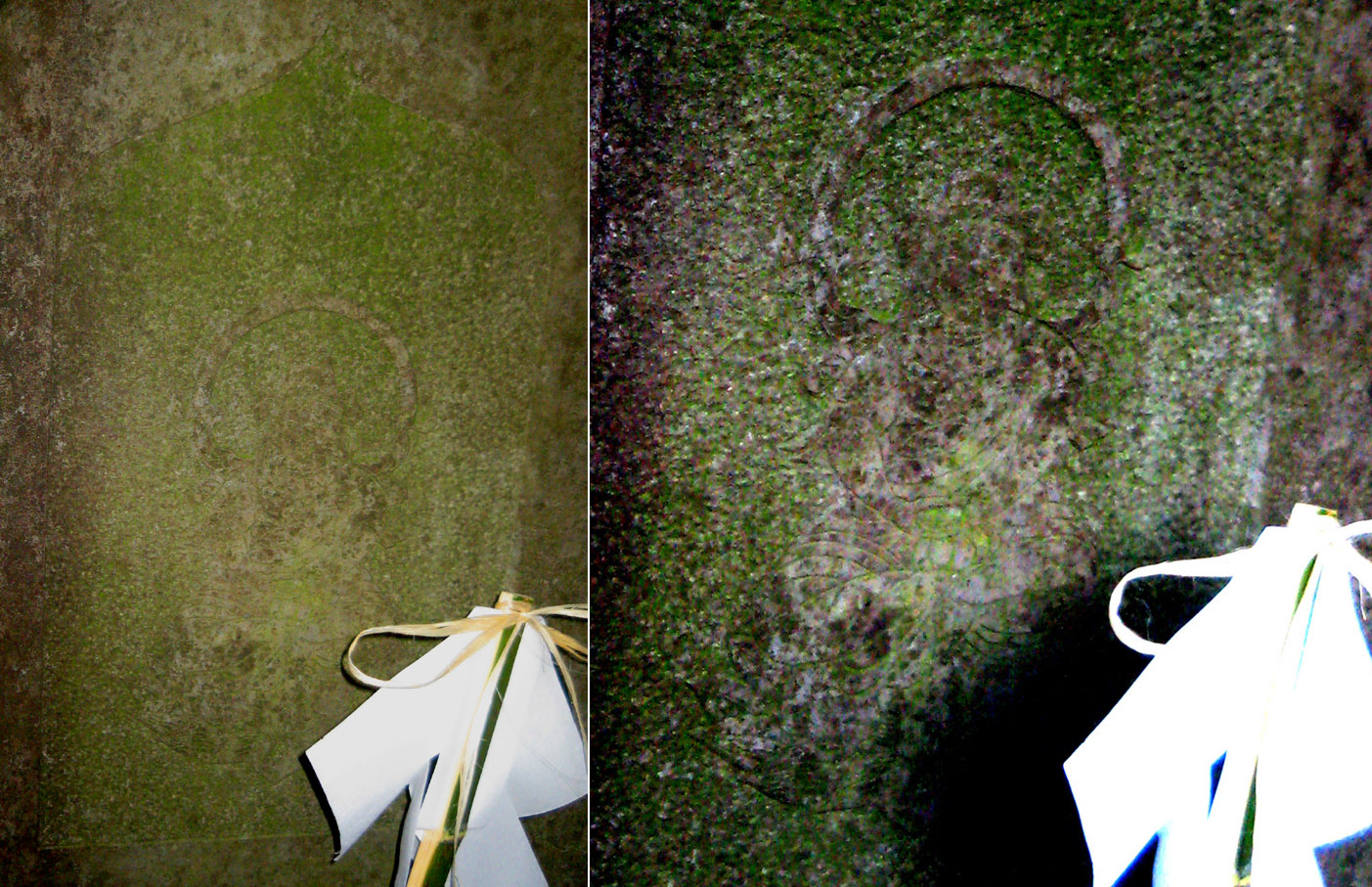 大日如来座像が刻まれています。つまり仏さま。(右側は寄った図)
