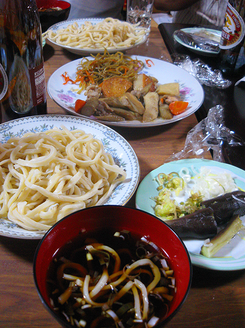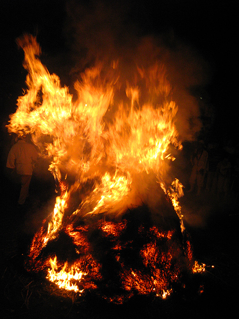 近くの盆踊り会場から聞こえる「炭坑節」が合図となって、講の方たちは一瞬気が引き締まります。 時計を見れば、ちょうど9時。 先達を先頭に、講員が「掛け念仏」を唱えながら、下山を始めます。 掛け念仏は、バランスを考慮して、前半分・後半分を交互に唱えられるように並びます。 地上に下りました。麦藁でできた大松明のまわりを、右回りに3回まわります。 先達が大幣束(大麻 おおぬさ)を振りかざし、「四方固め」の形でお祓いをします。 正面→左側→裏側→右側→正面の5箇所です。 そして、火を招くためのいくつかの儀式が始まります。四方固めにて両手を使って「火の道を開く」所作や、 経本仕立てのお伝えをパラパラと開き、火に向かって「言霊を投じる」。鮮やかです! 待ちに待った「点火」。 そして、参加者に向けてお祓いが始まります。位置は四方固めにのっとって。 今年は火のまわりがとても早い。松明は巨大な生き物のように燃え上がり、人々に襲いかかるようでした。すごい迫力でした。強風が吹いたのと、松明がふんわりしていた(麦の量が少なかった)からです。自然を相手のことですから、火の表情は毎年違います。 この後、講中が再び掛け念仏を唱えながら登拝を始めると、群集はスコップとバケツを手に、松明の燃えカスに突進します。 昨年の様子はコチラです♪ そして、一瞬にして静寂が戻って来ます。 富士塚を仰げば、そこには森の中に吸い込まれそうな幻想的な光景が! 今年はまた、ひと味違った気持ちでお焚き上げに立ち会うことができました。ありがとうございました♪ 後片付けをし、先達のお宅へと向かいます。荷物は車で運びますが、私は講の方たちと歩きます。これが、とても気持ちのいい数分間なのです。 「この向こうに川があってね。。。」 「自分が生まれた家はそこでさ。。。」 お話を聞きながらのんびりと「夜道の散策」です。 先達のお宅で直会です。 床の間には、今まで使った大幣束が立て掛けてあって、その多さに驚きました。 心づくしの手料理に感謝しっぱなしでありました。本当に美味しい。 「では、また来年ね♪」 そんな言葉をかけられた私の心にも、火が灯ったのでした。うるうる。