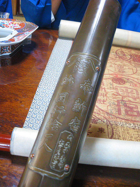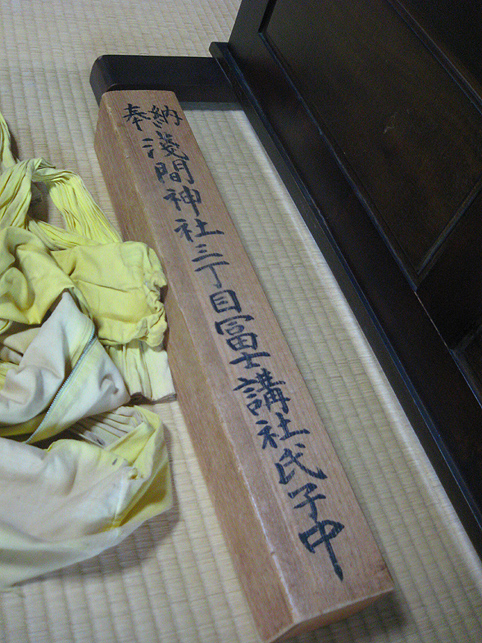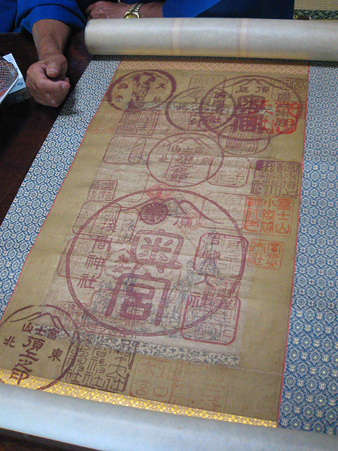 ひょえ〜! ひと月以上経ってしまいました〜。 千葉市稲毛の富士講のお焚き上げレポの書きかけでした。→コチラ では最初から。火をつける前の状態。 講員は3人。講元(左の方。中央は先達)のお宅の神棚の下、掛軸を掲げ、 拝み箪笥でのお焚き上げです。 掛軸は1枚。富士山が描かれ、角行と食行が並んでいるのが見えますが、 その上に、おびただしい数の御朱印が捺されています。 やはり、北口から登られています。それにしてもすごい朱印の迫力。 掛軸は、こんな立派な銅の筒の中に収まっていました。「新宿」は各地にありますね。現在は別の表記になっていたりします(ここでも地名には残らず)が、昔ながらの呼び名で説明されると、地域のことがわかりやすいです。これを背負って富士登山をしていたとのことでした。 「浅間神社三丁目富士講社」というのが彼らが名乗る講名で、千葉市の稲毛浅間神社の氏子さんたちです。富士講ですが、稲毛浅間の斜面で目にした山水講とはどうやら無関係のようでした。 この日は千葉の富士塚友達 Eさんからお誘いを受け、お焚き上げ見学に同席させていただきました。稲毛地区の富士講に関しては、おそらく彼が追跡調査をしていることと思います♪ つづく。。。