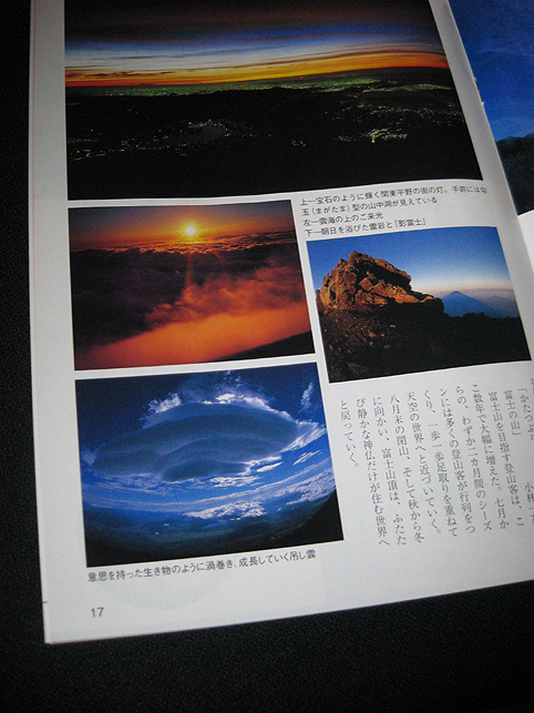 実りの秋、収穫の季節です。そして今日は中秋の名月。天に輝く月を仰ぎ、宇宙や地球や自然を感じませう。ありがたい気持ちになりませんか? 満月の夜によくするように、私は今夜も(不動明王を彫った)クリスタルを月光浴させています♪ そして、ちょっとかぐや姫のことなど思い出して。不死の薬を富士山(不死の山)で焼き、満月に還って行ったストーリーを。 「マイハーベスト」という情報誌があります。 名月にあやかって、画像にもちょっと光を入れてみました。 HARVEST…いい言葉です。自然に感謝するとともに、自分が今までやって来たことを認め、実らせましょう。自分自身を信じてあきらめず、前向きになりながら。 (自分に言い聞かせています) この中で、富士塚(と私)が取りあげられましたので、アップしました。感謝しております。 今号の特集はズバリ「富嶽360度」、富士山です。 ほかにもグルメが唸りそうな料理や宿など、16ページに満載です。 中でも気になったのが、小岩井大輔さんの写真、 富士山上空に現れる「吊し雲」。気圧や気流の条件が重なって生まれる独特な雲です。私はこれが好き。だって、UFOがカムフラージュに作った雲ですもんね(笑)。 あ、満月の夜のお話ですから♪