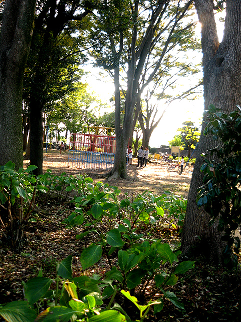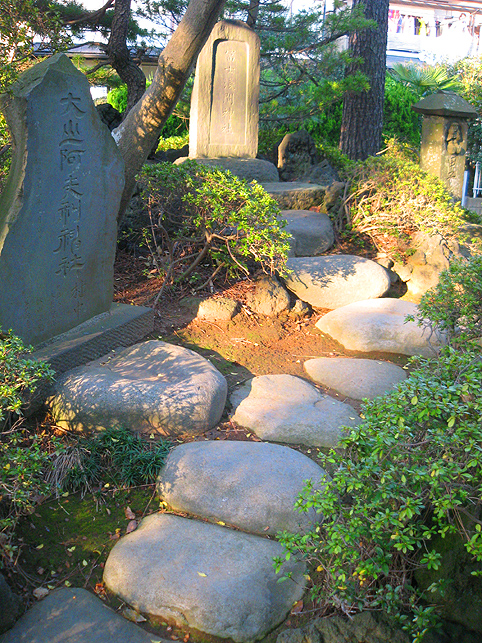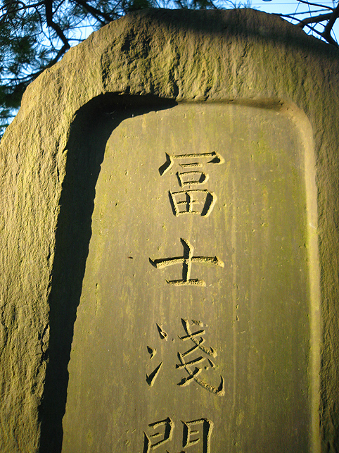 隣接するのは、気持ちのいい公園です。 公園側から、塚の側面を見てみました。 低いながら塚の形状です。でもこれは富士塚なのか、そうでないのか。 考えあぐねていると、地元の人々が何人も、稲荷神社だけでなく塚にもお参りに来るのに遭遇しました。中には、長い時間丁寧に手を合わせて拝んでいる人もいます。 しばらくすると、巾着袋を手に、各神様の賽銭を集めている人がいらっしゃいました。氏子さんでした。 「この塚にはいろんな神様が祀られているようですが」 「う〜ん。沢山あるけど、全部お参りする必要はないんですよ。自分が好きな神様だけ拝めばいいと思うんです」 「なるほど。ところでこれらの神様は、かつてあちこちにいたのをここにまとめたのでしょうか?」 「それはよくわからないのですが、以前稲荷神社の社殿を移動した際、この塚ができました。庭園ぽく作られていますが、いろんなお山の神様がいるでしょう?三峰山、妙義山、富士山、大山。。。」 「いろいろ拝めて合理的かもしれませんね!それにしても、たくさんの登山道がありますね」 「どこからでも登れるんですよ。あの奥が富士山です。富士山が一番高いからね〜♪」 私はこの塚が愛おしく見えてきました。講があってもなくても、史蹟の歴史が曖昧でも、現在拝む人にとってこの場所は貴重な聖地です。 この塚全体を富士塚とはとらえにくいですが、少なくとも、ボク石があしらわれた一隅は富士塚と言えるでしょう。 最後に振り返って、いとまごいしようとしたら、 富士塚の碑だけが、 輝いていました。 これはきっと富士山からのメッセージ!? 踵を返して、もう一度、登拝をしました。 実は、こういうことはよくあります。例えば、訪れた場所に日射しがなくしょんぼりしても、帰り際にこんな西日のギフトがあったりします。 自分がそこに来たのは何かの縁かもしれない。そう思ってしばらくその場にたたずんでみましょう。こんないいこともありますからね♪ 有り難い。