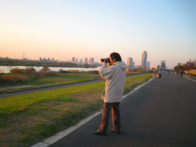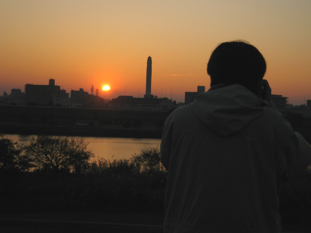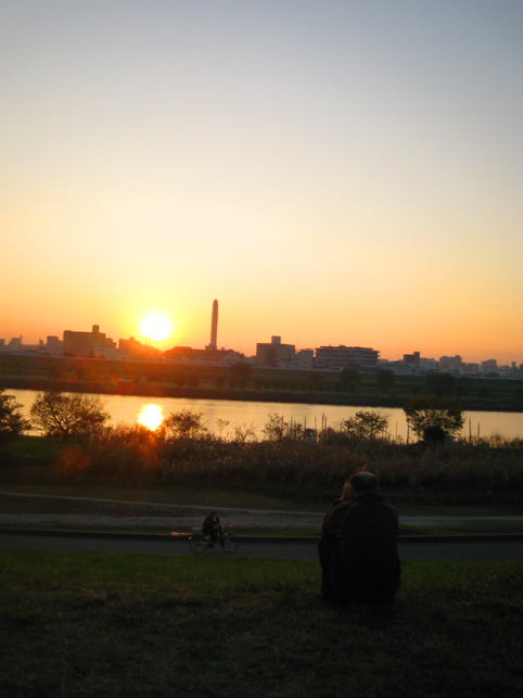 ここは荒川沿い。鹿浜橋近くの、足立区都市農業公園です。 土手はいい感じに夕陽を浴びています。4時17分から始まるダイアモンド富士を求めて人が集まってきました。 土手の向こう、ビューポイントを予告されたところでは黒山の人だかり。手前でカメラを手にするのは、御存知、田代 博先生です。メディアにもよく登場されるし、HPを御覧になった方も多いでしょう。 「先生、今日の富士山はどうですか〜?」 晴れてはいますが、ちょっとモヤッてきました。ダイヤモンドの光彩は希望どおりに輝かないけれど、これもダイヤモンド富士です。 富士山のシルエットが見えてきました。頂上の幅と太陽の幅がほぼ同じに重なります。 でも、私のカメラではとてもムリ。 ダイヤモンド田代だ〜!なんて言いながら遊んでました。先生ごめんなさい(笑)。 本当はこんなに素晴らしかったです。→田代先生のサイトで画像をたっぷり♪ もっと晴れている場合、太陽が富士山にかかるにはどのような経過でどう見えるのか、教えてくださいました。富士山に沈んだ後も余韻が素晴らしく、左上の空に富士山の影が出る、大きくまわりにドーム型の光りが見える、などなど。。。先生、ありがとうございました。 先生はとてもピュアな方でした。富士山が好きで好きでたまらない、その様子はまわりの人をも幸せにします。そしてやっぱり。。。富士山を愛する人は富士山に愛される♡