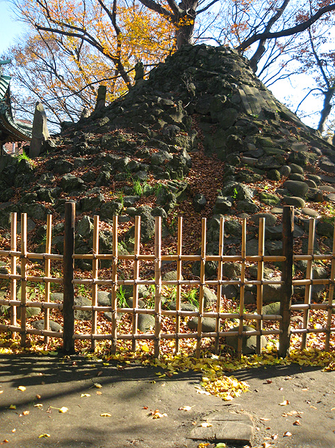 堀江富士は、典型的なコニーデ型。 銀杏の葉を背景に、シルエットが美しい。斜面を登る石像は山玉講の先達たち。知人のお祖父さんを含む、実在の人物です。 反時計まわりに歩くと、小御嶽の傍に育った雑草が緑鮮やかでした。 真裏にある、大澤くずれに落ち葉がたまっていました。 この富士塚はボク石は少なく、丸石と角石が多く使われています。特徴は頂上付近。カーブをつけるために、角石を横に配して留めてあります。現在は登拝禁止となり、竹垣に覆われていますが、以前はよく登っていました。頂上は平坦なセメント固めで、人ひとりが座れるくらい。確か、直径数センチの穴があり、細めの鉄柱でも埋まっていた痕跡のようでした。一度、改築されているはず。この塚の歴史を知りたいところです。 落ち葉に埋まっても塚の形は健在です。大谷石もかなり使われているのが特徴です。ミソの部分が風化して凹んでいます。