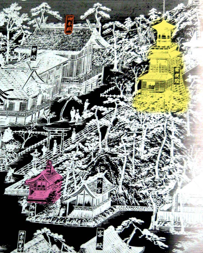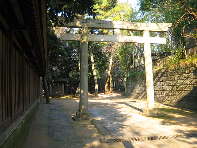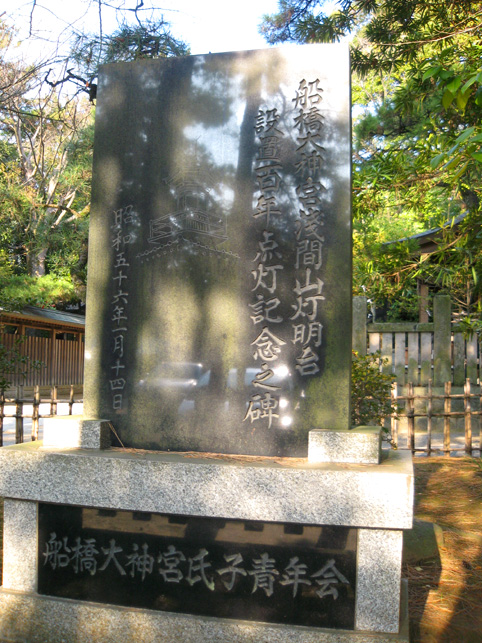 当然、一番見晴らしのいいところに灯台は建てられます。 それが浅間山と呼ばれる高台でした。ちょうど江戸名所図会に緑色につけたあたり。 海老川のふもとから続くゆるやかな丘の上に、さらにこんもりと盛り上がりがあるわけです。ここは「覆宮塚」という名の円墳(「意富比神」の墳墓)だという説があるのですが、その塚に浅間神社が祀られ浅間山と呼ばれたらしいです。古墳だったところが富士塚に使われた(と言われる)ケースもありますから、不思議ではありません。 現在の境内見取り図(御由緒に記載)にも、緑色をつけてみました。これには浅間神社は記されていないけれど、宮司が「ある」というのであるのでしょう。 この記念碑は、大鳥神社のすぐ南側に位置しています。(横に通る参道を隔て) しかし、この図(昭和27年作成。船橋中央図書館ロビーに掲げてあります)を見ると、その記念碑あたりもしくは大鳥神社の位置に浅間神社があった? ナゾといえばナゾですが、考えてみれば、時代時代で人は土地を現世のため合理的に活用するものです。また、管理する神社や氏子衆の意図により、表記が変わる可能性もあります。古墳だったところが、のちにその意識が薄れたり、一旦忘れられることもあるでしょう。 仮説として。かつて古墳だった塚に浅間神社が祀られ、富士塚のように富士山扱いつまり浅間山とされた。その後、氏子である漁師たち(ここは漁師町でした)により、その頂上に建てられた常夜灯が立派な灯台に変わった。そして浅間神社は北側に移動した。 現在、浅間神社は大鳥神社の奥。玉垣の中で、通常は公開されていませんが、神社によって守られていることも確かです(毎年7月1日の富士山の山開きの日には例祭あり)。 大鳥神社は西向き。その前の参道を進むと閉ざされた門があり、手前右手に、先の看板(灯明台に関する)があるのです。 覗けばここまで見ることができます。う〜ん。浅間神社はあの中かなぁ。でも、見取り図には常磐神社とあるし。。。中に入りたいなぁ。 と、思っていたところ、幸運はやって来ました♪ 門を開けて作業をする方たちに、ちょっとだけ見せてもらうことができたのです。でも、もともと普段は入ってはいけないところ。私も奥へは踏み込まず、入れただけでも有り難いと思い、ナゾはナゾのままにしておきました。 実は時々、マナーの悪い研究者の話を聞きます。調査とはいえ、地元の人たちが大事にしているところや品々を荒らす人がいるそうです。いや、決して壊したりするわけではないですが、お参りもせずにいきなり写真を撮ったりすることだって、地元の人にとっては荒らされた気持ちになるわけで。よくわかりますよ。 よかった。私は絶対そういうこと、ないですから。地元の方の気持ちを害するくらいなら、謎を解明しなくたっていいと思っています。 そのぶん、コミュニケーションから情報を得ることができます。 作業員のおじさん情報。 「昔はね、ここは見晴らしよくってね、筑波山まで見えたんだよ♪」 「灯明台祭?その前に初詣においで。上に登れるよ。中には4本の柱が斜めにあってしっかりした造りだ。灯台守の家族が住んでいた階下は和室だけど、灯をともしたところは六角形の洋室だよ。光は今のららぽーとまで届いたんだってさ」云々。 時間のある方は、お正月に是非! つづく。。。