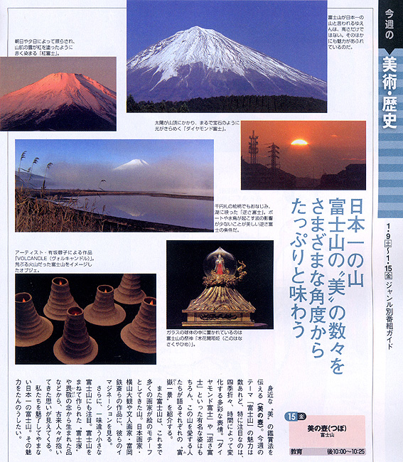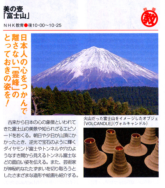 The Mark of Beauty …… 英訳すると、どうしても薄っぺらになっちゃいますが、 「美の壺」のことです。(訳でなく、いい英コピーを考えたいなぁ) 今週15日(金)のNHKの「美の壺」は富士山特集です。 4日発売の「ウイークリーステラ」(表紙は福山龍馬)に掲載されています。 私の作品「VOLCANDLE」(←造語の意味わかりますよね?)が出ます。 あ、私も。短いですが、富士塚を案内してると思います♪ ★田代 博先生もご出演ですよ。 テレビガイドではこんなふう。 3チャンネル 22:00〜22:25です。ご笑覧ください。 …………………………………………………………………………………… 【NHK 美の壷】 (本放送)教育 金曜日 22:00〜 (再放送)教育 月曜日(日曜日深夜)0:15〜 (再放送)BS2 火曜日 16:00〜 (再放送)BShi 金曜日 7:00〜 (再放送)総合 土曜日 5:15〜